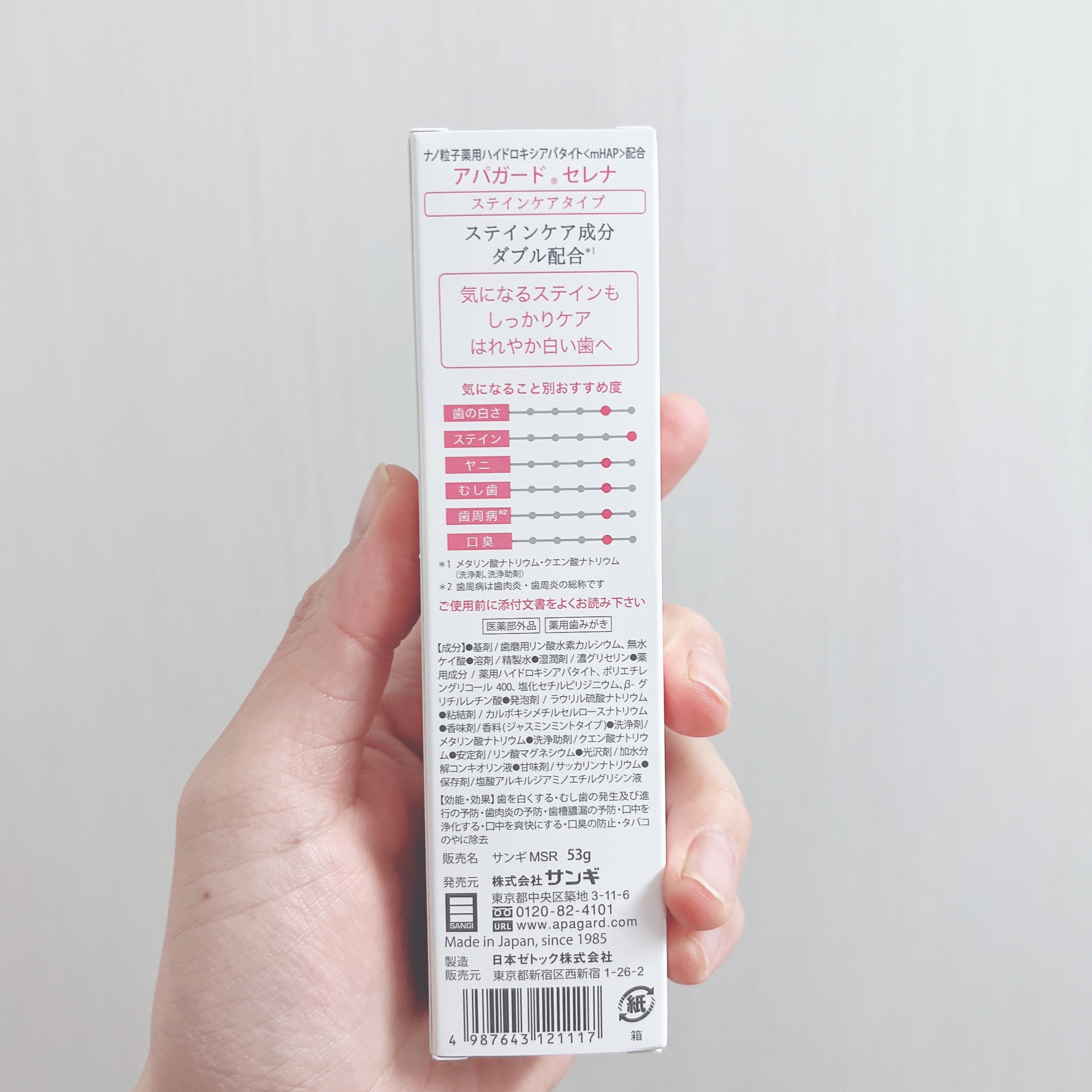 - 【医薬部外品】 美白歯みがき「アパガード」シリーズのステインケアタイプ。サンギ開発のむし歯予防成分「薬用ハイドロキシアパタイト」を配合。歯とほぼ同じ成分(歯のエナメル質の97%はハイドロキシアパタイト)で、エナメル質にアプローチ! さらにステインケア成分をダブル配合*し、コーヒーや紅茶・ワインなどの気になる着色汚れを落とします。 ステインケアではれやか白い歯に。 *メタリン酸ナトリウム(洗浄剤)・クエン酸ナトリウム(洗浄助剤) ●医薬部外品/薬用歯みがき 販売名:サンギMSR