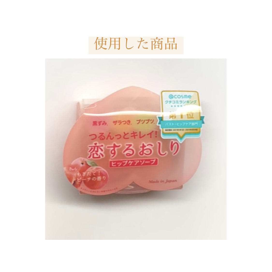 - 恋するおしり ヒップケアソープ おしりの黒ずみ・ザラつき・ブツブツにくるくる直接洗いの簡単ケア! (1)余分な古い角質を落とす:角質ケア スクラブ※1&ピーリング成分※2配合 【モモ核、マンナン※1 グルコノバクター/ハチミツ発酵液、 リンゴ酸・乳酸・クエン酸※2】 (2)必要なうるおいを守る:保湿ケア 6種※3の美容保湿エッセンスを配合 【モモ葉エキス、モモ種子エキス、ビワ葉エキス、キウイエキス、 アーチチョーク葉エキス、アロエベラ液汁※3】 ◎「きゅんっ」とする もぎたて!ピーチの香り