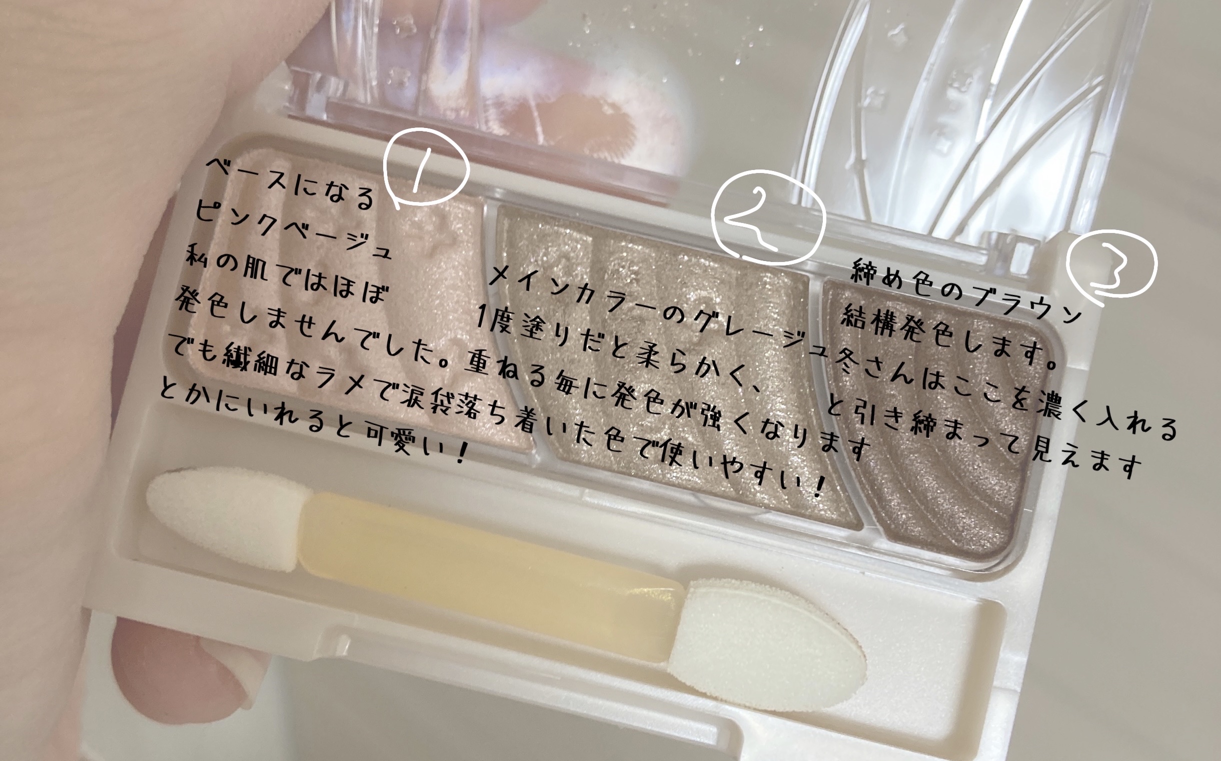 サラッとしてるけどピタッと密着。ラメ落ちは感じませんでした。 淡いです!濃いめが好きな人には物足りないかも💦逆にセザンヌのベージュトーンアイシャドウやビーアイドルのヌードベージュが好きな人はドンピシャだと思います! 派手すぎない色味 今のところなし