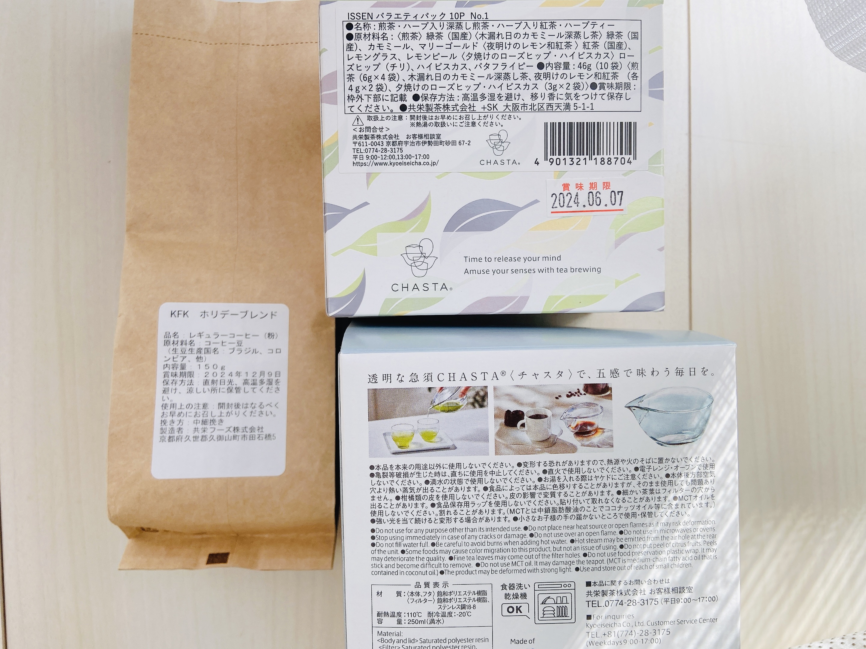 五感で味わう急須「CHASTA(チャスタ)」 手になじむように設計された持ち手のないデザインで、熱〜いお湯を淹れても普通に片手で楽々持って淹れられます! 左利きさんも淹れやすい急須だと思います^^ ガラス製でも中の茶葉が見れて楽しい物もありますが、こちらはガラスや陶磁器ではないのに中が見れて、しかもガラス製じゃないので割れなくてGood❤️ 使い切りタイプの個包装なので、使う分だけ開封できて持ち運びにも便利で良いです⭕️ CAFE KFK ホリデーブレンド[150g]は、可愛いパッケージでプレゼントにも喜ばれそう(❁´◡`❁) 紅茶は、ハーブが身体に良さそうに見えます。