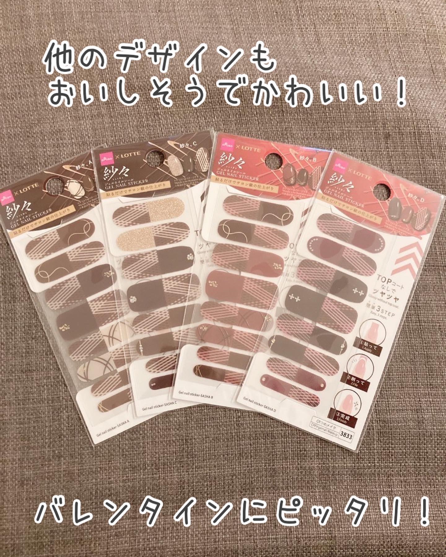 ダイソーは毎年人気の紗々ネイル! 今年はリボンのデザインがお気に入り!貼ってみるのが楽しみです✨ セリアはチョコ以外にもあって、ホワイトデーにも良さそうです! 明るくてかわいらしい雰囲気でした! ダイソーの硬化タイプのブラウン系もいい感じ! 剥がれにくいのでおすすめです✨
