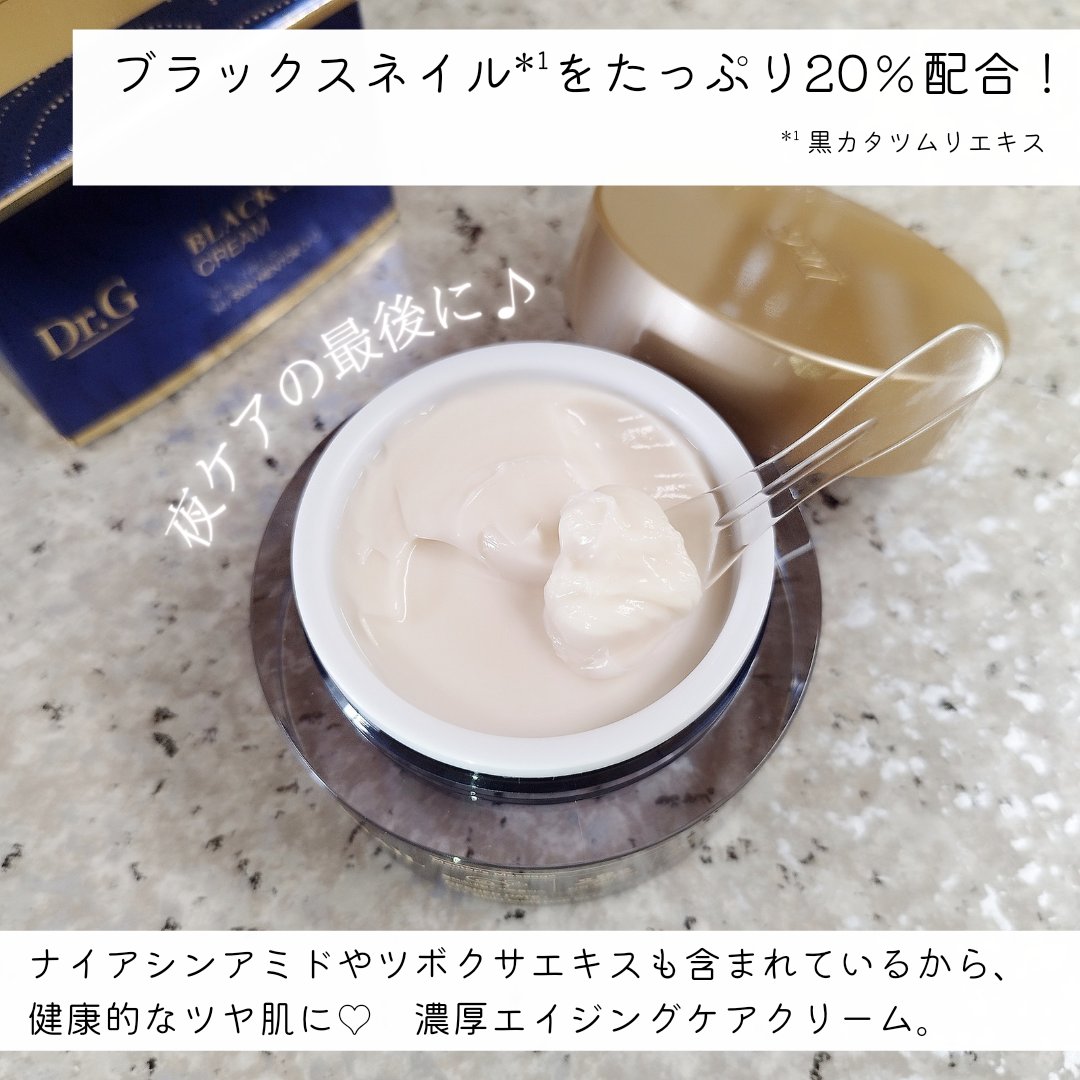 テクスチャー自体はかためなのにお肌への浸透はなめらか! ドクタージーがお肌のために考案した優れもの✨ 保湿だけでなく、美白、しわ、弾力対策にも✨ ブラックスネイルを20%&ブラックプロポリスが配合されていてアンチエイジングにぴったり🩷 ナイアシンアミドやツボクサエキスなども含まれています✨