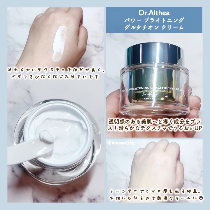 Dr.Altheaパワーブライトニンググルタチオンクリームうーん微妙かなぁ…何回もチャレンジしたけどモロモロが発生するかなぁいろんな使い方したけどね。白くなるけどなんか怖いくらいにwちょと無理かもとなりました。まだ有るからw夜に使うかボディ用...