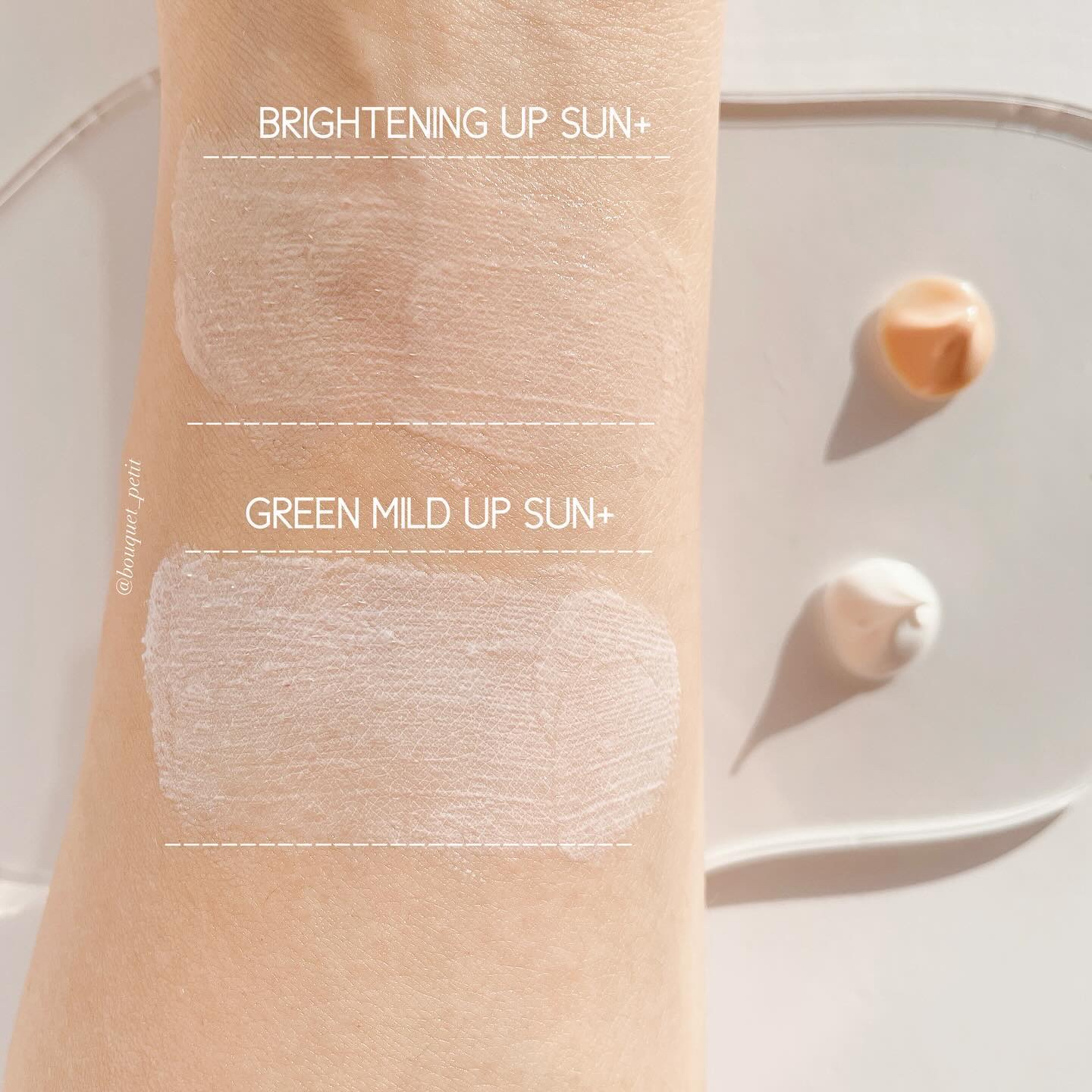 ブライトニングアップサンプラスは化粧下地としても使える日焼け止めです◎ ピーチ色ベースなタイプで、自然にトーンアップ*してくれます🤲´- グリーンマイルドアップサンプラスはオリーブヤングで5年間連続日焼け止め部門受賞🌟⋆꙳ やわらかいクリームタイプでベタつかず密着!! 整肌に効果的なツボクサエキスとハリを向上させるピクノジェノール配合𓂃𓈒 どちらもなめらかによく伸びるから塗りやすいし、コスパもいいなと思ったよ😇🙌