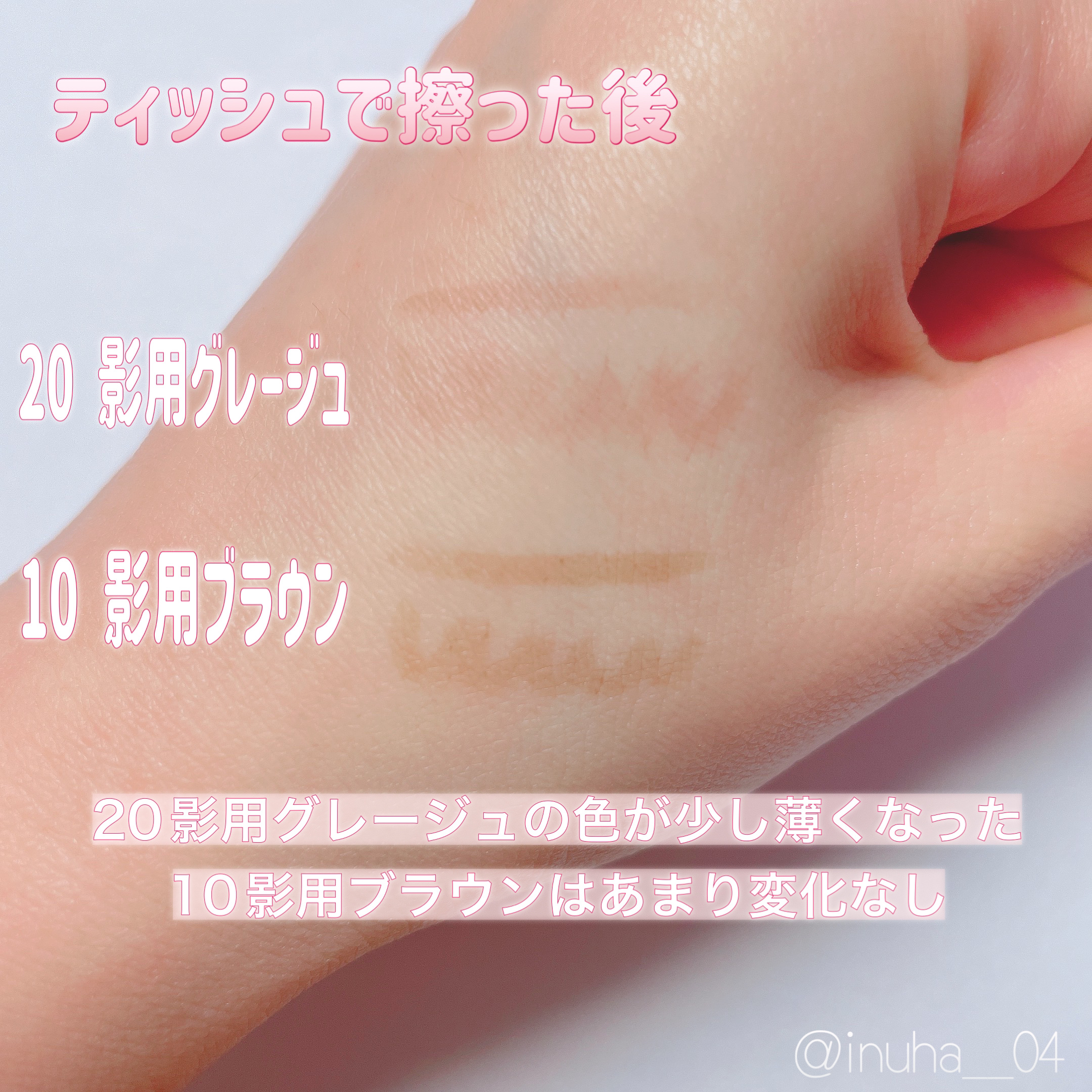 - <10 影用ブラウン> 水、BG、アクリレーツコポリマー、ペンチレングリコール、スルホコハク酸ジエチルヘキシルNa、エタノール、カミツレ花エキス、(+/-)黄4、赤227、青1 <20 影用グレージュ> 水、BG、アクリレーツコポリマー、ペンチレングリコール、スルホコハク酸ジエチルヘキシルNa、エタノール、カミツレ花エキス、(+/-)黄4、赤227、青1 <30 影用ピンク> 水、BG、アクリレーツコポリマー、ペンチレングリコール、スルホコハク酸ジエチルヘキシルNa、エタノール、カミツレ花エキス、(+/-)赤227、黄4、青1