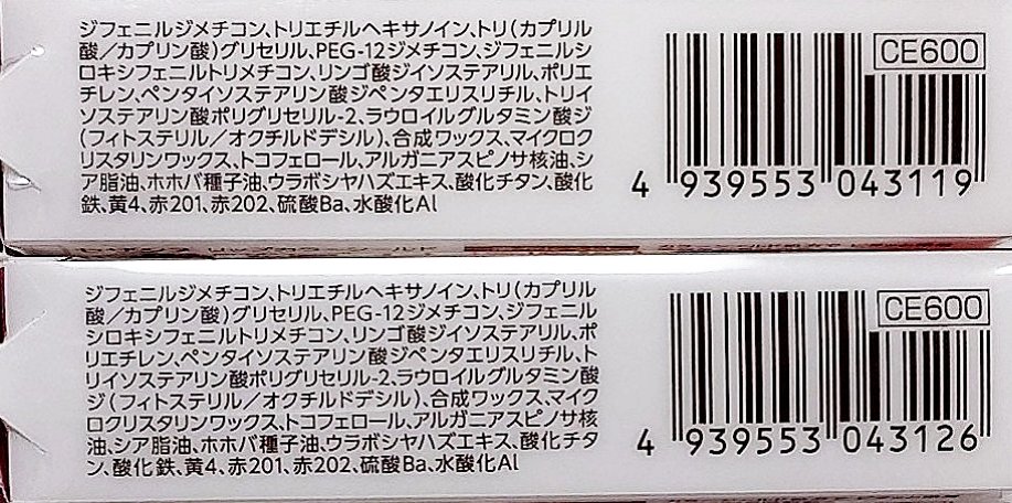- <01 フィグブラウン> ジフェニルジメチコン、トリエチルヘキサノイン、トリ(カプリル酸/カプリン酸)グリセリル、PEGー12ジメチコン、ジフェニルシロキシフェニルトリメチコン、リンゴ酸ジイソステアリル、ポリエチレン、ペンタイソステアリン酸ジペンタエリスリチル、トリイソステアリン酸ポリグリセリルー2、ラウロイルグルタミン酸ジ(フィトステリル/オクチルドデシル)、合成ワックス、マイクロクリスタリンワックス、トコフェロール、アルガニアスピノサ核油、シア脂油、ホホバ種子油、ウラボシヤハズエキス、酸化チタン、酸化鉄、黄4、赤201、赤202、硫酸Ba、水酸化Al <02 オランジュベージュ> ジフェニルジメチコン、トリエチルヘキサノイン、トリ(カプリル酸/カプリン酸)グリセリル、PEGー12ジメチコン、ジフェニルシロキシフェニルトリメチコン、リンゴ酸ジイソステアリル、ポリエチレン、ペンタイソステアリン酸ジペンタエリスリチル、トリイソステアリン酸ポリグリセリルー2、ラウロイルグルタミン酸ジ(フィトステリル/オクチルドデシル)、合成ワックス、マイクロクリスタリンワックス、トコフェロール、アルガニアスピノサ核油、シア脂油、ホホバ種子油、ウラボシヤハズエキス、黄4、酸化鉄、酸化チタン、赤201、赤202、硫酸Ba、水酸化Al <03 ココアブラウン> ジフェニルジメチコン、トリエチルヘキサノイン、トリ(カプリル酸/カプリン酸)グリセリル、PEGー12ジメチコン、ジフェニルシロキシフェニルトリメチコン、リンゴ酸ジイソステアリル、ポリエチレン、ペンタイソステアリン酸ジペンタエリスリチル、トリイソステアリン酸ポリグリセリルー2、ラウロイルグルタミン酸ジ(フィトステリル/オクチルドデシル)、合成ワックス、マイクロクリスタリンワックス、トコフェロール、アルガニアスピノサ核油、シア脂油、ホホバ種子油、ウラボシヤハズエキス、酸化鉄、酸化チタン、黄4、赤201、赤202、硫酸Ba、水酸化Al <04 メロウピンク> ジフェニルジメチコン、トリエチルヘキサノイン、トリ(カプリル酸/カプリン酸)グリセリル、PEGー12ジメチコン、ジフェニルシロキシフェニルトリメチコン、リンゴ酸ジイソステアリル、ポリエチレン、ペンタイソステアリン酸ジペンタエリスリチル、トリイソステアリン酸ポリグリセリルー2、ラウロイルグルタミン酸ジ(フィトステリル/オクチルドデシル)、合成ワックス、マイクロクリスタリンワックス、トコフェロール、アルガニアスピノサ核油、シア脂油、ホホバ種子油、ウラボシヤハズエキス、酸化チタン、酸化鉄、黄4、赤201、赤202、硫酸Ba、水酸化Al <05 アンティークローズ> ジフェニルジメチコン、トリエチルヘキサノイン、トリ(カプリル酸/カプリン酸)グリセリル、PEGー12ジメチコン、ジフェニルシロキシフェニルトリメチコン、リンゴ酸ジイソステアリル、ポリエチレン、ペンタイソステアリン酸ジペンタエリスリチル、トリイソステアリン酸ポリグリセリルー2、ラウロイルグルタミン酸ジ(フィトステリル/オクチルドデシル)、合成ワックス、マイクロクリスタリンワックス、トコフェロール、アルガニアスピノサ核油、シア脂油、ホホバ種子油、ウラボシヤハズエキス、酸化鉄、酸化チタン、黄4、赤201、赤202、硫酸Ba、水酸化Al <06 ロゼベージュ> ジフェニルジメチコン、トリエチルヘキサノイン、トリ(カプリル酸/カプリン酸)グリセリル、PEG―12ジメチコン、ジフェニルシロキシフェニルトリメチコン、リンゴ酸ジイソステアリル、ポリエチレン、ペンタイソステアリン酸ジペンタエリスリチル、トリイソステアリン酸ポリグリセリル-2、ラウロイルグルタミン酸ジ(フィトステリル/オクチルドデシル)、合成ワックス、マイクロクリスタリンワックス、トコフェロール、アルガニアスピノサ核油、シア脂油、ホホバ種子油、ウラボシヤハズエキス、酸化チタン、酸化鉄、黄4、赤201、赤202、硫酸Ba、水酸化Al <07 スイートローズ> ジフェニルジメチコン、トリエチルヘキサノイン、トリ(カプリル酸/カプリン酸)グリセリル、PEG―12ジメチコン、ジフェニルシロキシフェニルトリメチコン、リンゴ酸ジイソステアリル、ポリエチレン、ペンタイソステアリン酸ジペンタエリスリチル、トリイソステアリン酸ポリグリセリル-2、ラウロイルグルタミン酸ジ(フィトステリル/オクチルドデシル)、合成ワックス、マイクロクリスタリンワックス、トコフェロール、アルガニアスピノサ核油、シア脂油、ホホバ種子油、ウラボシヤハズエキス、酸化チタン、酸化鉄、黄4、赤201、赤202、硫酸Ba、水酸化Al <08 チェリーレッド> ジフェニルジメチコン、トリエチルヘキサノイン、トリ(カプリル酸/カプリン酸)グリセリル、PEG-12ジメチコン、ジフェニルシロキシフェニルトリメチコン、リンゴ酸ジイソステアリル、ポリエチレン、ペンタイソステアリン酸ジペンタエリスリチル、トリイソステアリン酸ポリグリセリル-2、ラウロイルグルタミン酸ジ(フィトステリル/オクチルドデシル)、合成ワ
