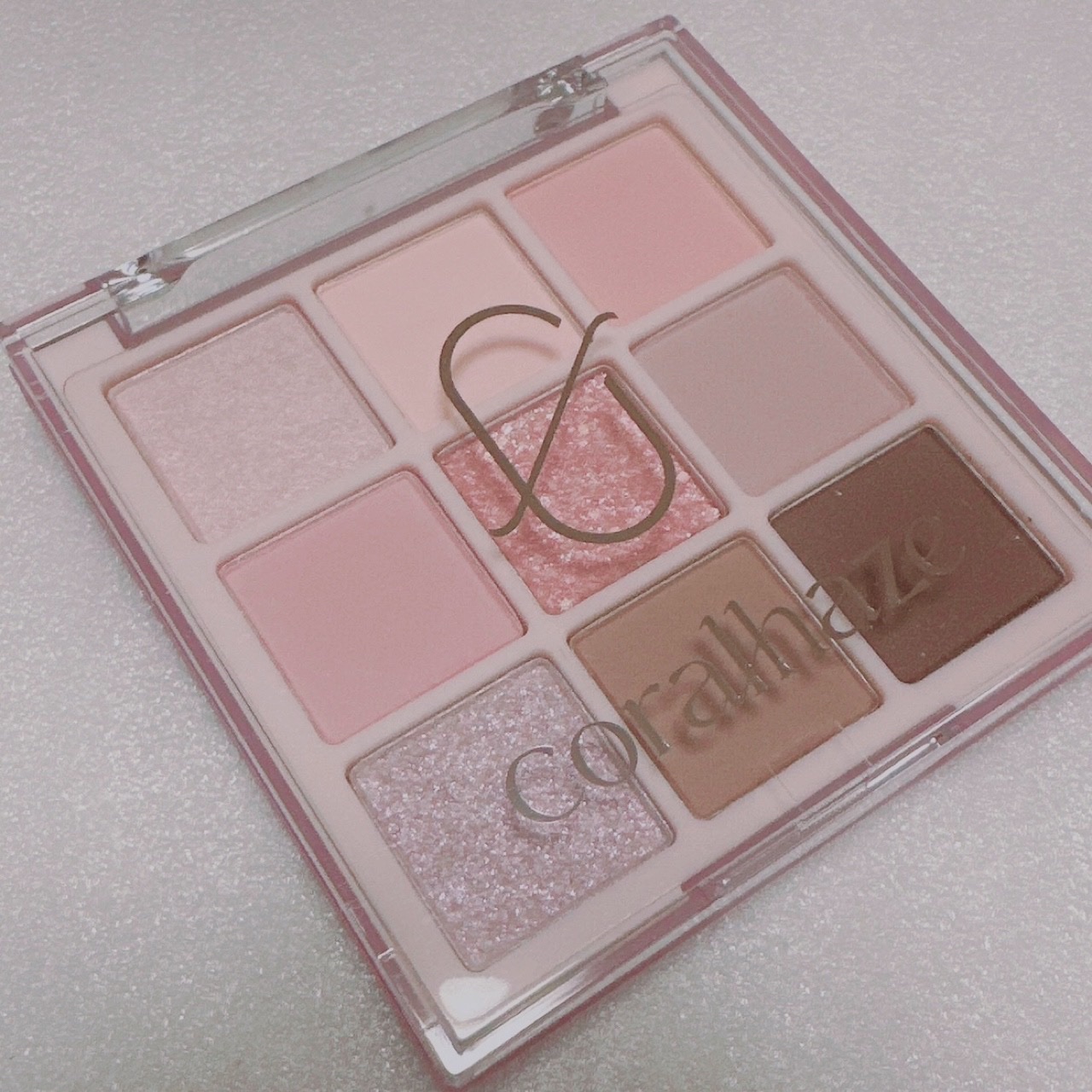 透明感あふれる淡いラベンダーピンク🪻 普段あまり韓国コスメを使わないのでドラッグストアやバラエティショップなどで見たときの完全な偏見になりますが🤣 コーラルヘイズのパレットは9色入りだけどサイズ小さめで持ち運びしやすく、サラッとした粉質で発色も控えめでした。 #03 PINKMOONは青み寄りの淡いピンク系が揃ったカラー💓 特に目を惹くのが真ん中のグリッター🫶🏻