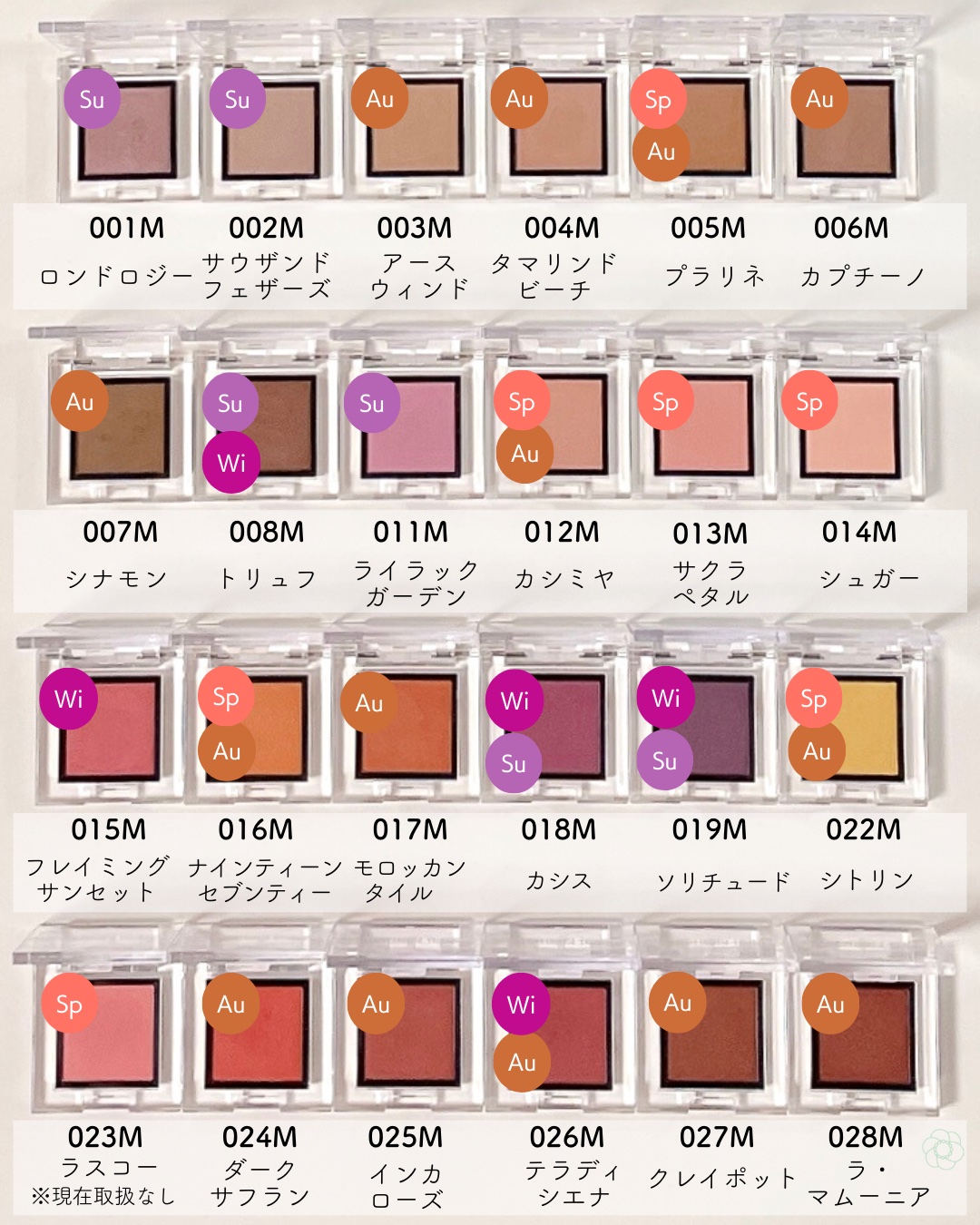 - <001M Londolozi> タルク、合成金雲母、(アクリレーツ/アクリル酸エチルヘキシル)クロスポリマー、ジメチコン、窒化ホウ素、パルミチン酸オクチル、ラウロイルリシン、ステアリン酸亜鉛、(HDI/PPG/ポリカプロラクトン)クロスポリマー、アミノプロピルトリエトキシシラン、シリカ、ジメチコノール、ジメチルシリル化シリカ、ハイドロゲンジメチコン、メチコン、グンジョウ、マイカ、酸化亜鉛、酸化鉄 <002M Thousand Feathers> タルク、合成金雲母、ジメチコン、シリカ、ミネラルオイル、ナイロン-12、窒化ホウ素、メチコン、トコフェロール、ハイドロゲンジメチコン、合成ワックス、グンジョウ、マイカ、酸化亜鉛、酸化鉄 <003M Earth Wind> タルク、合成金雲母、ジメチコン、シリカ、ミネラルオイル、ナイロン-12、窒化ホウ素、トコフェロール、ハイドロゲンジメチコン、メチコン、ラウリン酸亜鉛、合成ワックス、メチルパラベン、グンジョウ、マイカ、酸化チタン、酸化亜鉛、酸化鉄 <004M Tamarindo Beach> タルク、合成金雲母、ジメチコン、シリカ、ミネラルオイル、ナイロン-12、窒化ホウ素、トコフェロール、トリエトキシカプリリルシラン、ハイドロゲンジメチコン、メチコン、合成ワックス、水酸化Al、マイカ、酸化チタン、酸化亜鉛、酸化鉄 <005M Praline> タルク、合成金雲母、ジメチコン、シリカ、ミネラルオイル、ナイロン-12、窒化ホウ素、トコフェロール、トリエトキシカプリリルシラン、ハイドロゲンジメチコン、メチコン、合成ワックス、水酸化Al、グンジョウ、マイカ、酸化チタン、酸化亜鉛、酸化鉄 <006M Cappuccino> タルク、合成金雲母、ジメチコン、シリカ、ミネラルオイル、ナイロン-12、窒化ホウ素、トコフェロール、トリエトキシカプリリルシラン、ハイドロゲンジメチコン、メチコン、合成ワックス、水酸化Al、グンジョウ、マイカ、酸化チタン、酸化亜鉛、酸化鉄 <007M Cinnamon> タルク、合成金雲母、ジメチコン、シリカ、ミネラルオイル、ナイロン-12、窒化ホウ素、トコフェロール、トリエトキシカプリリルシラン、ハイドロゲンジメチコン、メチコン、合成ワックス、水酸化Al、マイカ、酸化チタン、酸化亜鉛、酸化鉄 <008M Truffle> タルク、合成金雲母、ジメチコン、シリカ、ミネラルオイル、ナイロン-12、窒化ホウ素、トコフェロール、トリエトキシカプリリルシラン、ハイドロゲンジメチコン、メチコン、合成ワックス、グンジョウ、マイカ、酸化亜鉛、酸化鉄 <009M Bad Love> タルク、合成金雲母、ジメチコン、シリカ、ミネラルオイル、ナイロン-12、窒化ホウ素、トコフェロール、トリエトキシカプリリルシラン、ハイドロゲンジメチコン、メチコン、合成ワックス、水酸化Al、グンジョウ、マイカ、酸化チタン、酸化亜鉛、酸化鉄 <010M The End> タルク、ジメチコン、ミネラルオイル、合成金雲母、シリカ、ナイロン-12、トコフェロール、BHT、ヘキサ(ヒドロキシステアリン酸/ステアリン酸/ロジン酸)ジペンタエリスリチル、ミツロウ、メチコン、ラウリン酸亜鉛、ワセリン、合成ワックス、窒化ホウ素、メチルパラベン、グンジョウ、マイカ、酸化チタン、酸化鉄 <011M Lilac Garden> タルク、合成金雲母、ジメチコン、シリカ、ミネラルオイル、ナイロン-12、窒化ホウ素、メチコン、トコフェロール、トリエトキシカプリリルシラン、ハイドロゲンジメチコン、合成ワックス、水酸化Al、クロルフェネシン、メチルパラベン、カルミン、グンジョウ、マイカ、酸化チタン、酸化亜鉛、酸化鉄 <012M Cashmere> タルク、合成金雲母、ジメチコン、シリカ、ミネラルオイル、ナイロン-12、窒化ホウ素、トコフェロール、ハイドロゲンジメチコン、メチコン、ラウリン酸亜鉛、合成ワックス、メチルパラベン、グンジョウ、マイカ、酸化チタン、酸化亜鉛、酸化鉄 <013M Sakura Petal> タルク、合成金雲母、ジメチコン、シリカ、ミネラルオイル、ナイロン-12、窒化ホウ素、メチコン、トコフェロール、ハイドロゲンジメチコン、ラウリン酸亜鉛、合成ワックス、メチルパラベン、カルミン、グンジョウ、マイカ、酸化チタン、酸化亜鉛、酸化鉄 <014M Sugar> タルク、合成金雲母、ジメチコン、シリカ、ミネラルオイル、ナイロン-12、窒化ホウ素、メチコン、トコフェロール、ハイドロゲンジメチコン、ラウリン酸亜鉛、合成ワックス、グンジョウ、マイカ、酸化チタン、酸化亜鉛、酸化鉄 <015M Flaming Sunset> タルク、合成金雲母、ジメチコン、(アクリレーツ/アクリル酸エチルヘキシル)クロスポリマー、パルミチン酸オクチル、窒化ホウ素、ラウロイルリシン、ステアリン酸亜鉛、(HDI/PPG/ポリカプロラクトン)クロスポリマー、アミノプロピルトリエトキシシラン、シリカ、ジメチコノール、ジメチルシリル化シリカ、トリエトキシカプリリルシラン、ハイドロゲンジメチコン、メチコン、水酸化Al、クロルフェネシン、メチルパラベン、カルミン、グンジョウ、マイカ、酸化チタン、酸化亜鉛、酸化鉄、黄4 <016M 1970> タルク、合成金雲母、ジメチコ