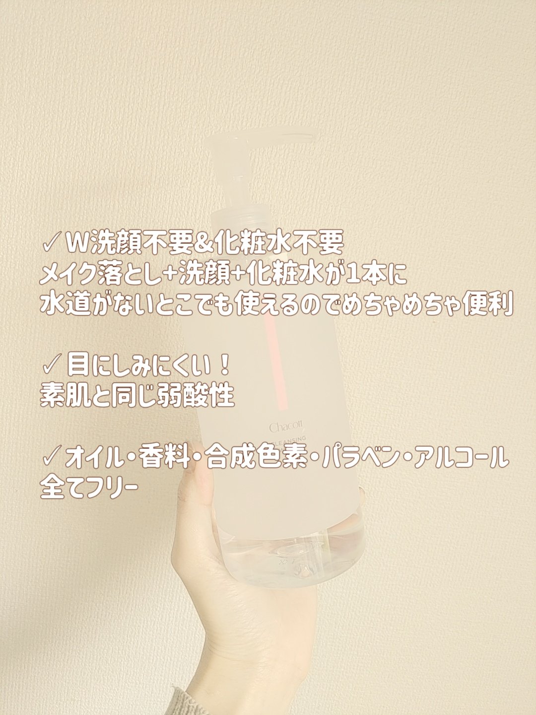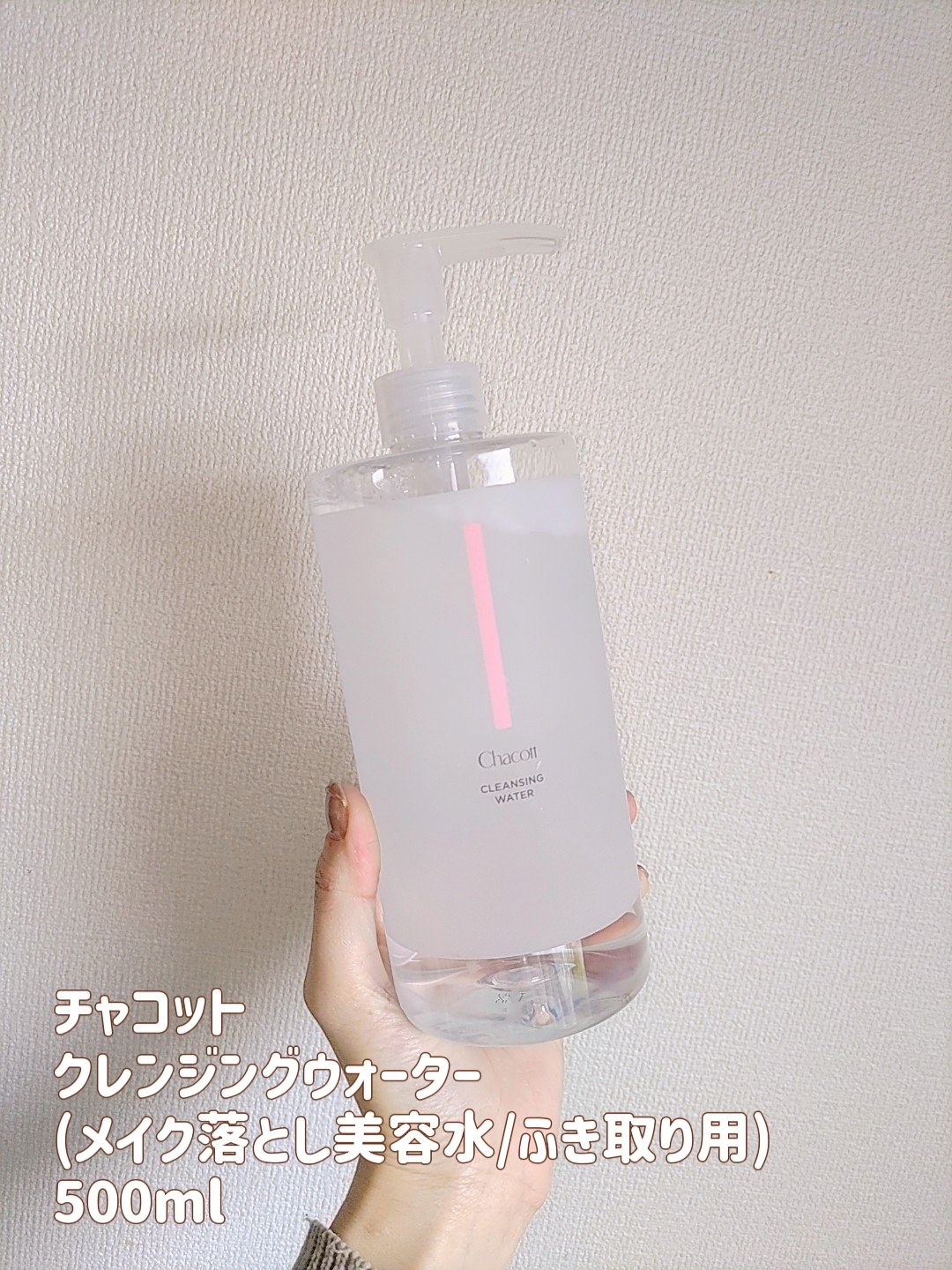 チャット クレンジングウォーター 500ml1,320円w洗顔&化粧水不要とありますが、私の使い方としては、帰ってからこれでポイントメイク中心に素早くささっと拭き取り、入浴時に丁寧にメイク落とします。弱酸性で、オイル、合成色素、パラベン、アル...