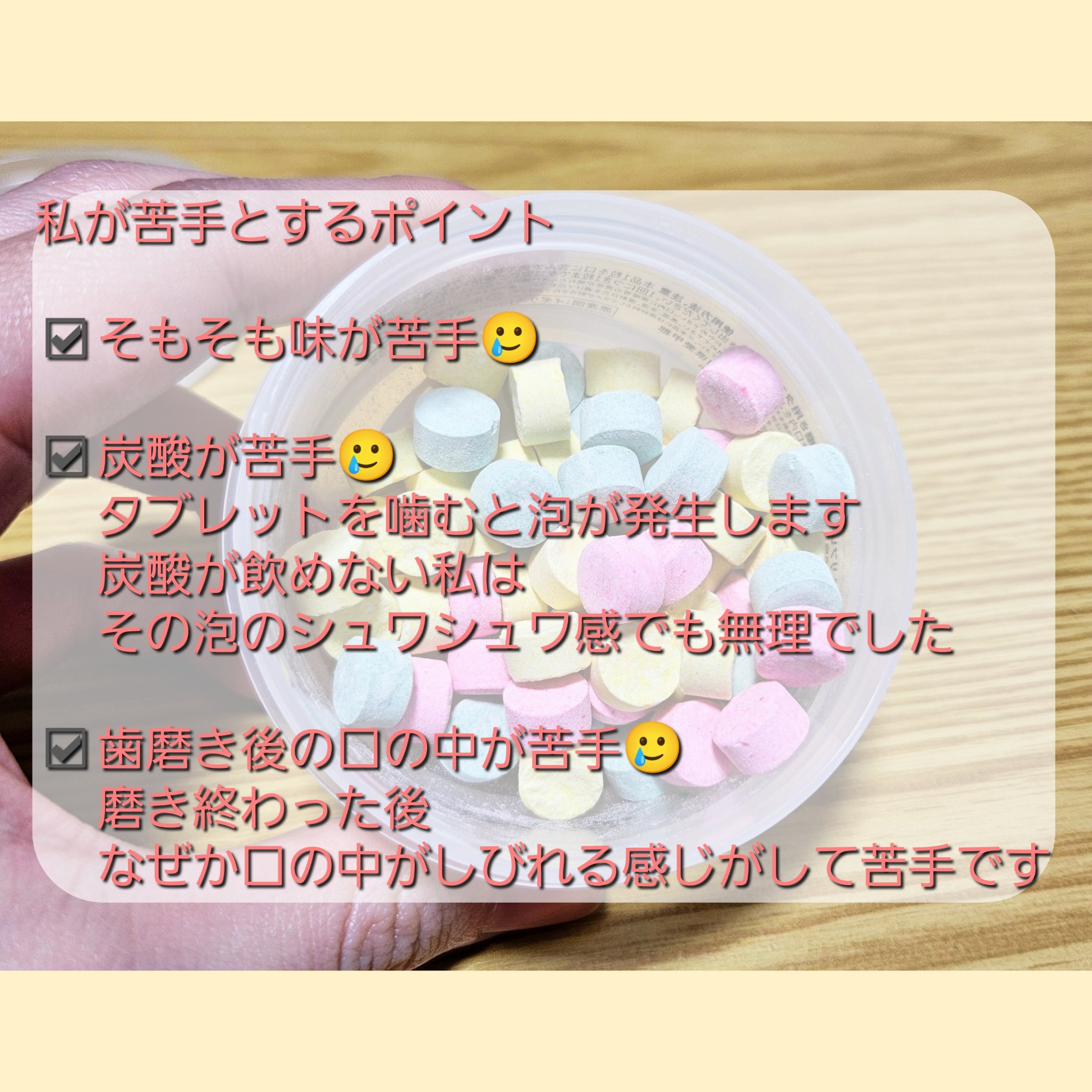 タブレットタイプのものは初めて使いましたが、思ったよりしっかり泡立ちました! 味ですが、3色とも全て同じ味でフルーティーなフレーバーで甘いです🍊✨ 1粒噛み砕いて濡れた歯ブラシで磨くだけなので手軽 フルーティーで甘いフレーバー!ミント味の歯磨き粉が苦手な方に特におすすめ 薬ケースに数粒入れたりして、持ち運びもしやすい◎ 見た目が可愛い♡ お菓子みたいで口に入れると無意識に飲み込んでしまいそうになる(実際に飲み込んだことはありません!) 普通の歯磨き粉の時よりもしっかりめに口をゆすがないと、口の中に残ってジャリジャリする💦