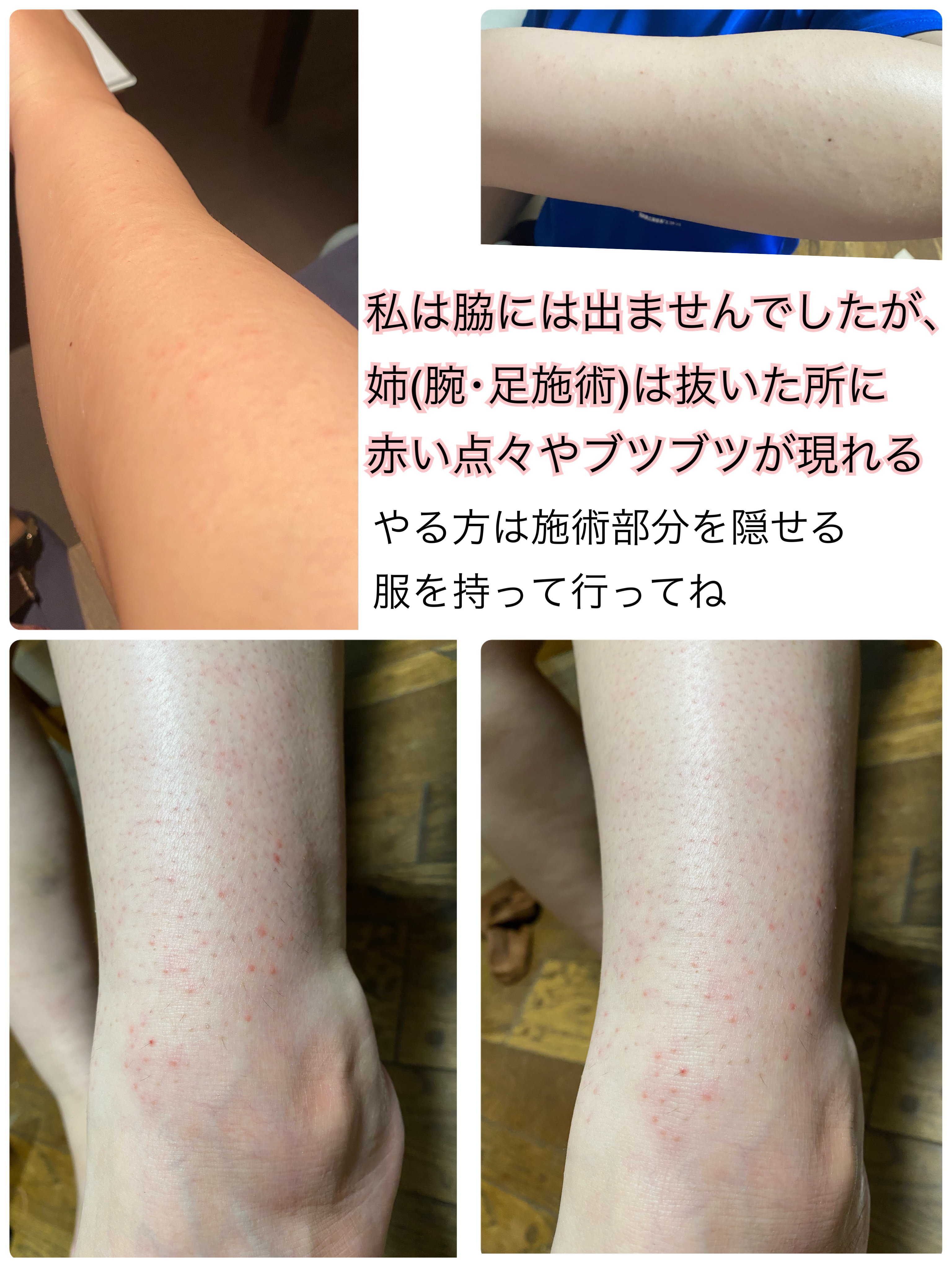 多分大事な事書き忘れてる。補足。 ①施術当日は、脇に物を塗るのは不可(脇汗抑えるor 匂い抑える物もダメ) 施術後塗っても良かったかは忘れた。気になる人は担当さんに聞いて! ②ピンセットでつまめる位毛が伸びてないと施術不可。画像位伸ばして行けとは言わないがある程度伸ばさないとお姉さん大変!画像10枚目位伸びてると安心!