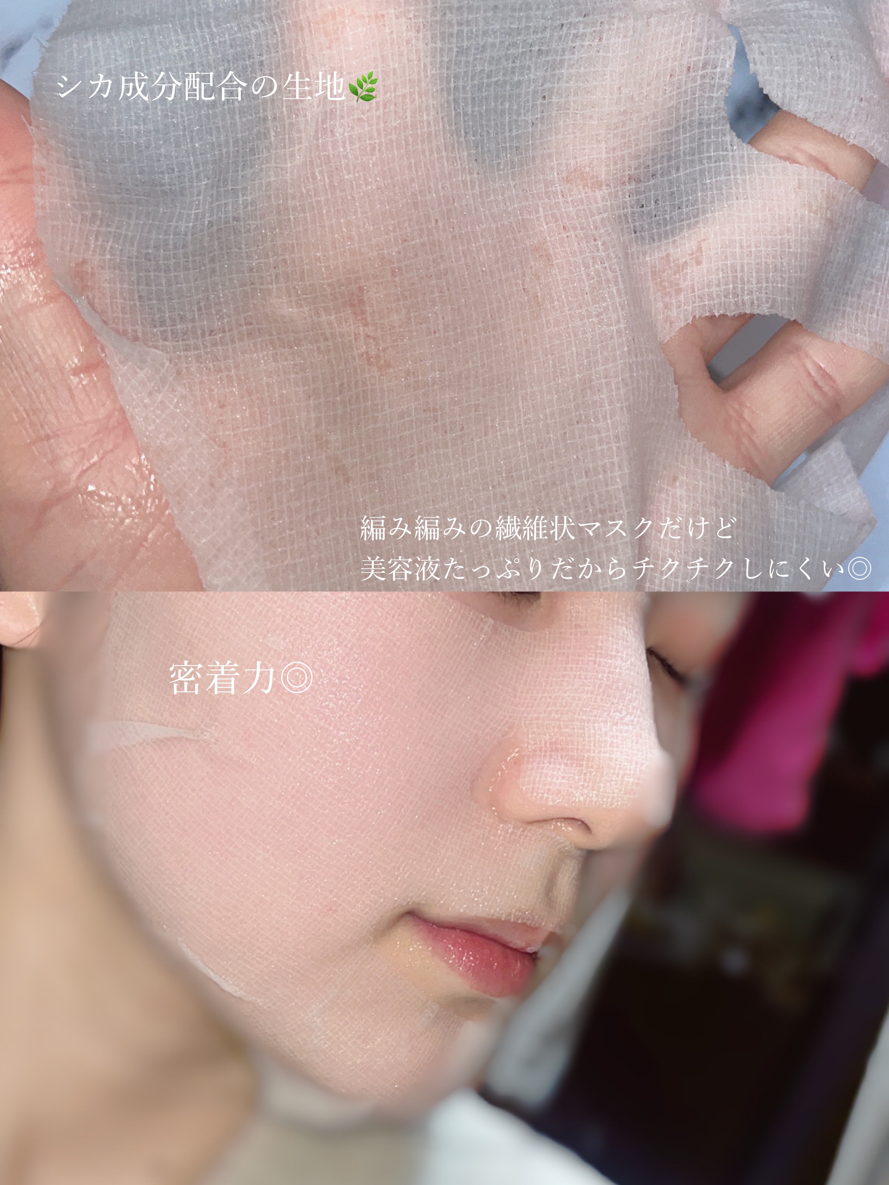 香りは香水のような香りです。 美容液はとろみがあります。シートマスクはCICAが配合されたガーゼ素材で薄くて肌への密着感が強いです。 15分程つけましたが途中で乾燥することもずれたりすることもありませんでした。 しっとりして保湿力は高いのでこれはやや重ためかなと思いましたがべたつきはしませんでした。 最初は香りが強いかと思いましたが使ってみるとそんなに強い香りではないと思いました。