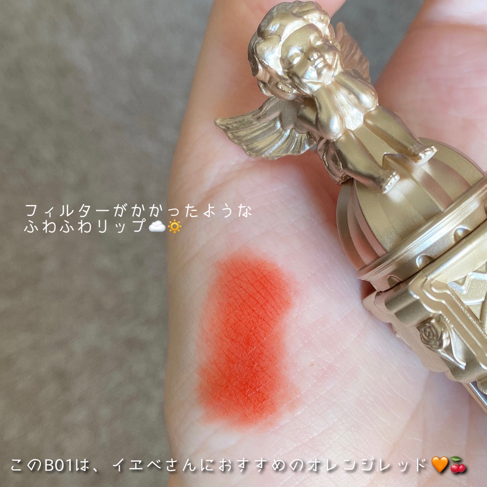 - 天使の羽のように軽やかなテクスチャーのリップ。しっとり質感のウェットマット、ふんわりスルスル広がる濃密な深みのある発色で唇を彩ります。