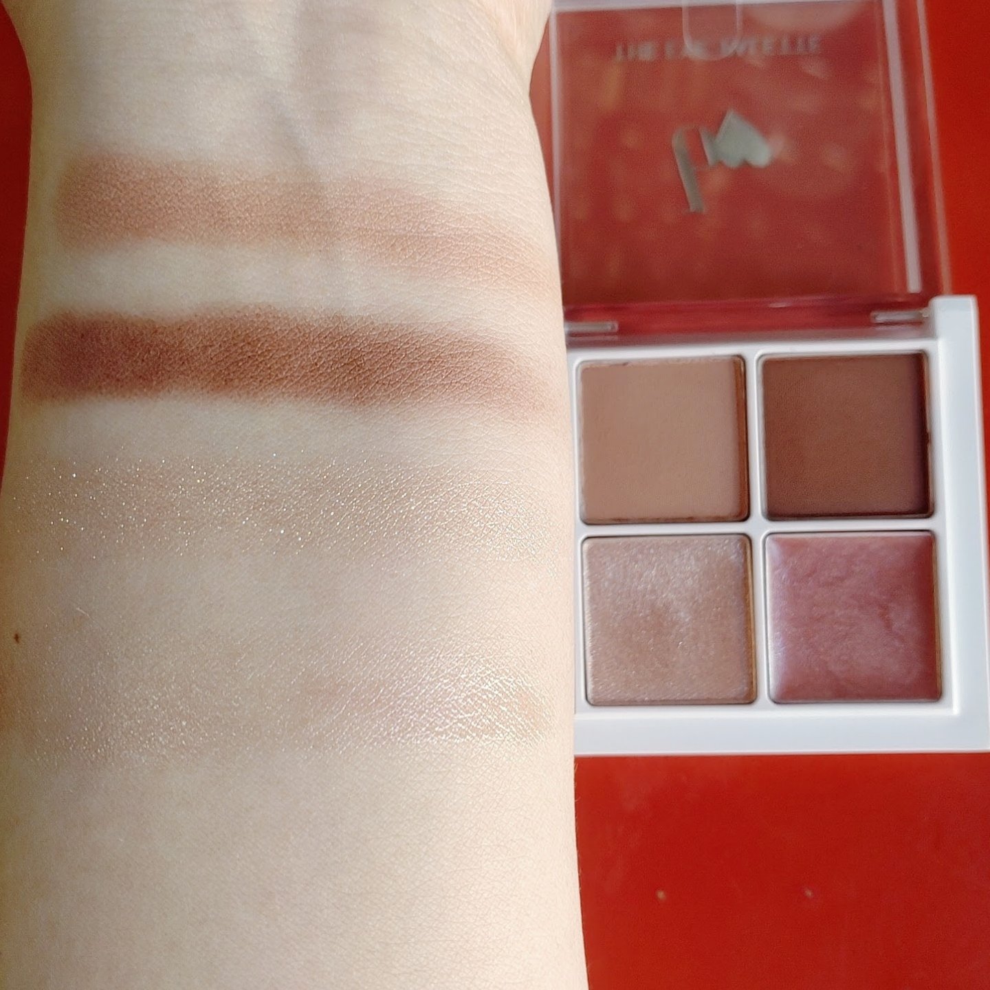 プチプラのクオリティじゃないっ!! 発売前からチェックしていたけれど、ここまで可愛いとは…😆 絶妙カラーで目もとのくすみを飛ばして*明るい印象に🩷 横割りグラデーションでメイクし、立体感をより出したかったので最後に1番左のカラーを上まぶたの真ん中と涙袋にのせています🙆 肌馴染みも良くて粉飛びも感じにくかったです💕 ブラウンの方も店頭に出てたら買おうかな💓