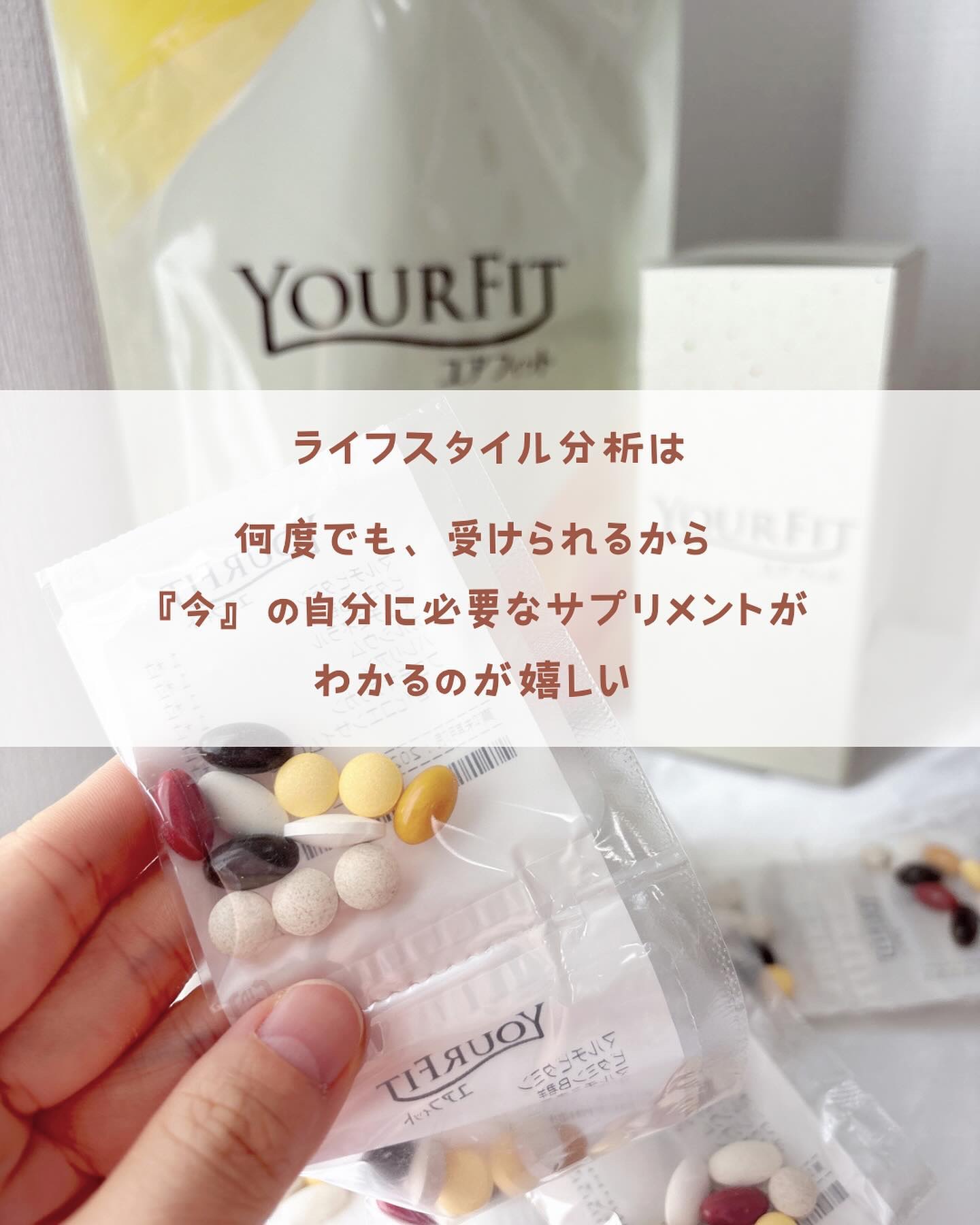 - 「ユアフィット」は、管理栄養士監修の食生活に関するアンケートにお答えいただくとあなたのライフスタイルを分析し、一人ひとりのライフスタイルにフィットしたサプリメントを組み合わせてご提案します。お客様自身でカスタマイズも可能です。また、ご利用中は管理栄養士によるチャット形式の栄養カウンセリングが何度でも無償で受けられるので、食生活に関する心配事をお気軽にご相談いただけます。 定期価格:6048円(税込)~ ※お選びいただくサプリメントの種類によって異なります。