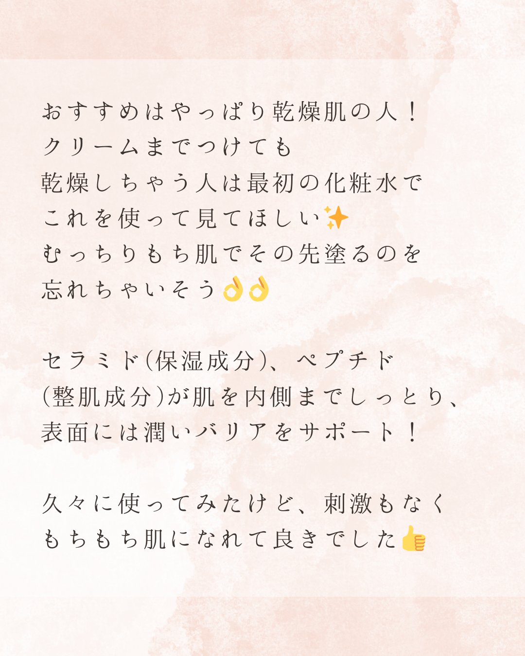 | シャバシャバ系の化粧水でサラっと軽いテクスチャーなのにしっかりと保湿感があるよ🙆♀️ | 詳細を見る | ||