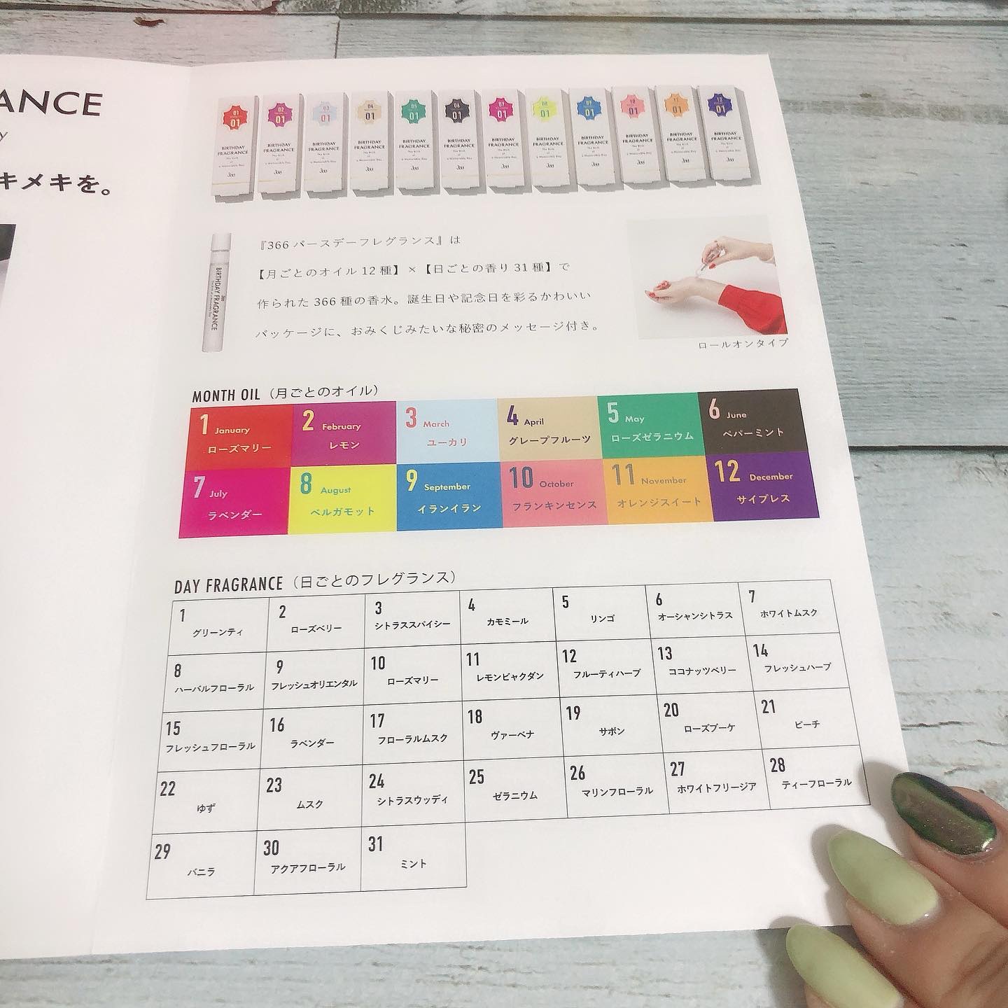 - バースデーフレグランスは『月ごとのオイル12 種』×『日ごとのフレグランス31 種』で構成されている366種類の香水です。1日として同じ香りはなく、記念日や好きなアーティストの誕生日など、特別”が生まれた日の贈り物にピッタリです。商品は店舗だけでなく、オンラインストアでの購入も可能なため、どなたでも購入しやすくなっています。366 種それぞれにメッセージが添えられており、開封後初めて見ることができるため、おみくじのような感覚で楽しむことができます。 香り:366種類それぞれの香り