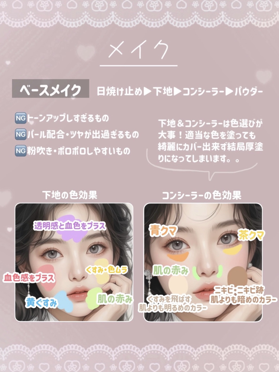 ベースメイクの順番はファンデーションの種類によっても違うのですが、 アイメイクはアイシャドウ→ビューラー→アイライン→マスカラという順番で行います。 アイメイクとのバランスを考えながら、どのリップを塗るかを決めます。 パウダーチークとクリームチークがありますが、クリームチークはムラになりやすいので初心者さんはパウダーがいいかも🙆♀️ ベースメイクの最後でもOKですが、全体のバランスを見ながら入れることでシェーディングが濃くなりすぎたりハイライトを付けすぎるなどの失敗が少なくなります。