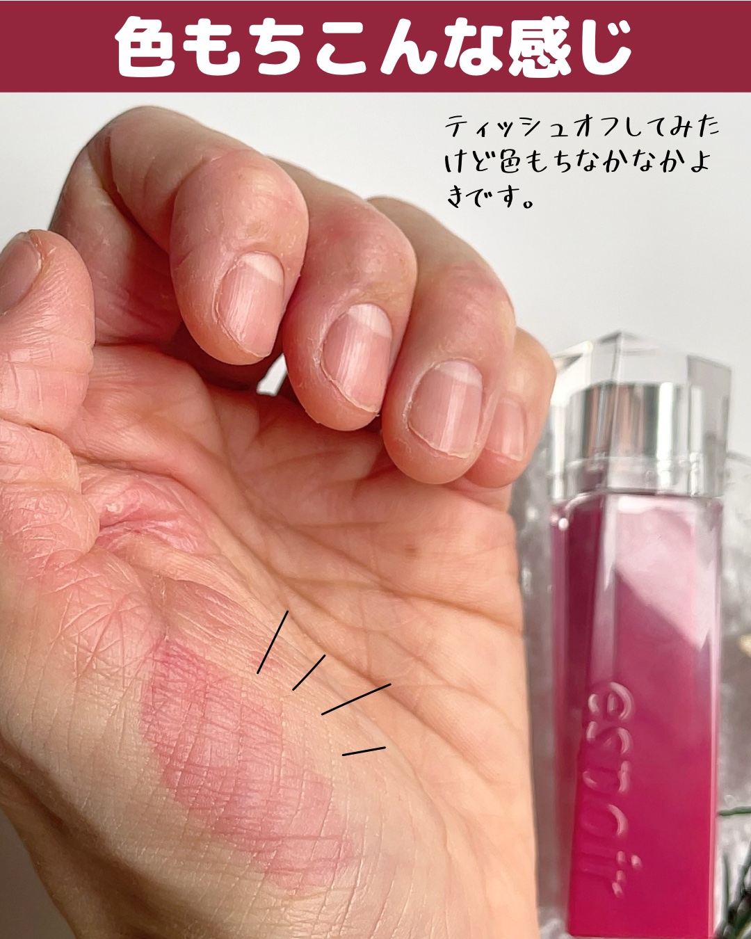 発色はけっこうよくて一度塗りでもしっかり色づく。 色持ちはティントじゃないからそこまでよくはないかな。 ツヤ感、透明感ありでどんなメイクの時にも使いやすい。 唇の血色悪い人はこの透明感で思ってたより発色しないかもしれない。 唇の血色いい人はヴィセの方が合ってそう。