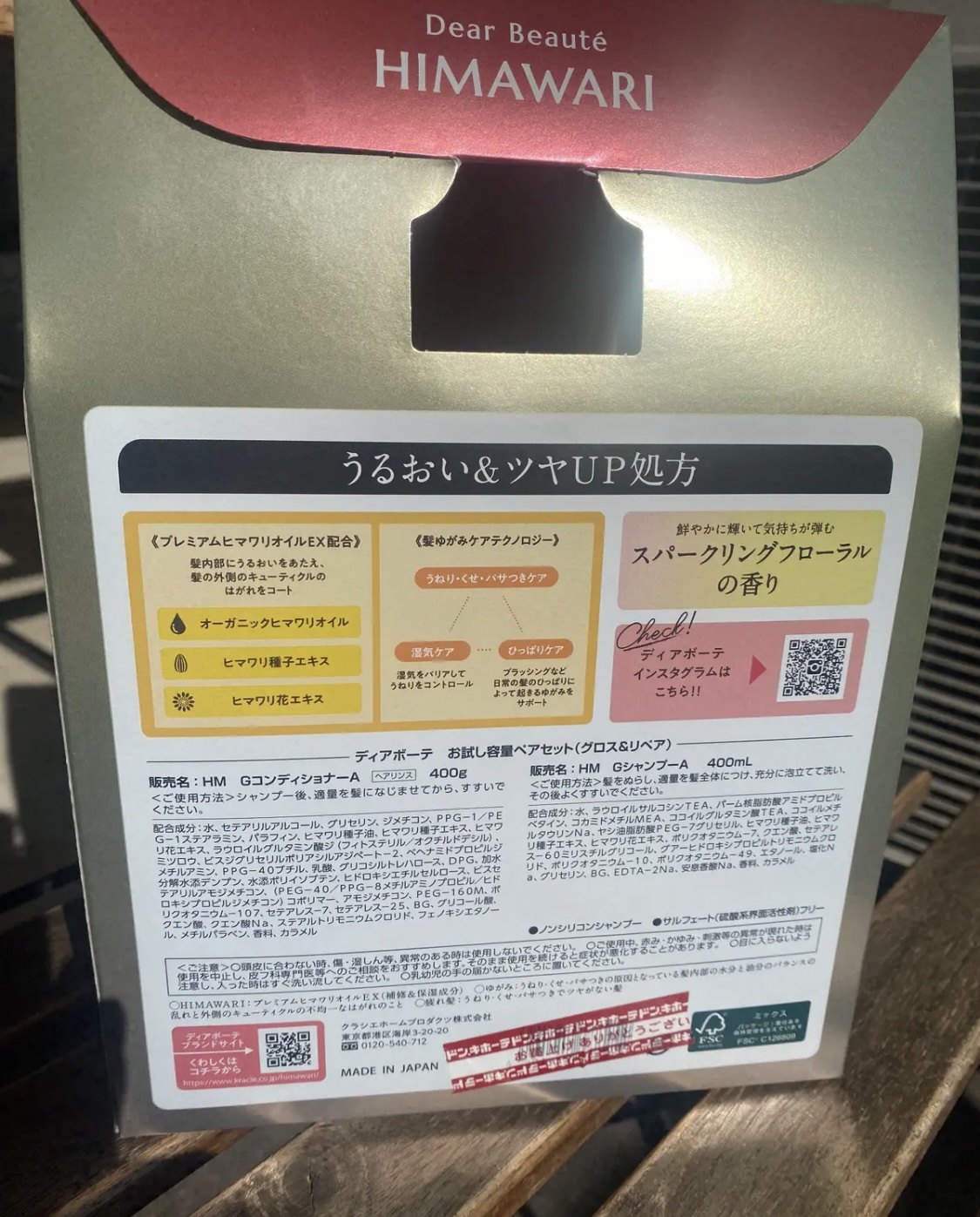 - <シャンプー本体> 水、ラウロイルサルコシンTEA、パーム核脂肪酸アミドプロピルベタイン、コカミドメチルMEA、ココイルグルタミン酸TEA、ココイルメチルタウリンNa、ヤシ油脂肪酸PEG-7グリセリル、ヒマワリ種子油、ヒマワリ種子エキス、ヒマワリ花エキス、ポリクオタニウム-7、クエン酸、セテアレス-60ミリスチルグリコール、グアーヒドロキシプロピルトリモニウムクロリド、ポリクオタニウム-10、ポリクオタニウム-49、エタノール、塩化Na、グリセリン、BG、EDTA-2Na、安息香酸Na、香料、カラメル <コンディショナー本体> 水、ラウロイルサルコシンTEA、パーム核脂肪酸アミドプロピルベタイン、コカミドメチルMEA、ココイルグルタミン酸TEA、ココイルメチルタウリンNa、ヤシ油脂肪酸PEG-7グリセリル、ヒマワリ種子油、ヒマワリ種子エキス、ヒマワリ花エキス、ポリクオタニウム-7、クエン酸、セテアレス-60ミリスチルグリコール、グアーヒドロキシプロピルトリモニウムクロリド、ポリクオタニウム-10、ポリクオタニウム-49、エタノール、塩化Na、グリセリン、BG、EDTA-2Na、安息香酸Na、香料、カラメル <シャンプー詰替> 水、ラウロイルサルコシンTEA、パーム核脂肪酸アミドプロピルベタイン、コカミドメチルMEA、ココイルグルタミン酸TEA、ココイルメチルタウリンNa、ヤシ油脂肪酸PEG-7グリセリル、ヒマワリ種子油、ヒマワリ種子エキス、ヒマワリ花エキス、ポリクオタニウム-7、クエン酸、セテアレス-60ミリスチルグリコール、グアーヒドロキシプロピルトリモニウムクロリド、ポリクオタニウム-10、ポリクオタニウム-49、エタノール、塩化Na、グリセリン、BG、EDTA-2Na、安息香酸Na、香料、カラメル <コンディショナー詰替> 水、ラウロイルサルコシンTEA、パーム核脂肪酸アミドプロピルベタイン、コカミドメチルMEA、ココイルグルタミン酸TEA、ココイルメチルタウリンNa、ヤシ油脂肪酸PEG-7グリセリル、ヒマワリ種子油、ヒマワリ種子エキス、ヒマワリ花エキス、ポリクオタニウム-7、クエン酸、セテアレス-60ミリスチルグリコール、グアーヒドロキシプロピルトリモニウムクロリド、ポリクオタニウム-10、ポリクオタニウム-49、エタノール、塩化Na、グリセリン、BG、EDTA-2Na、安息香酸Na、香料、カラメル