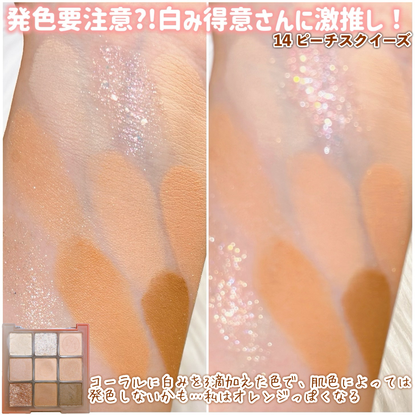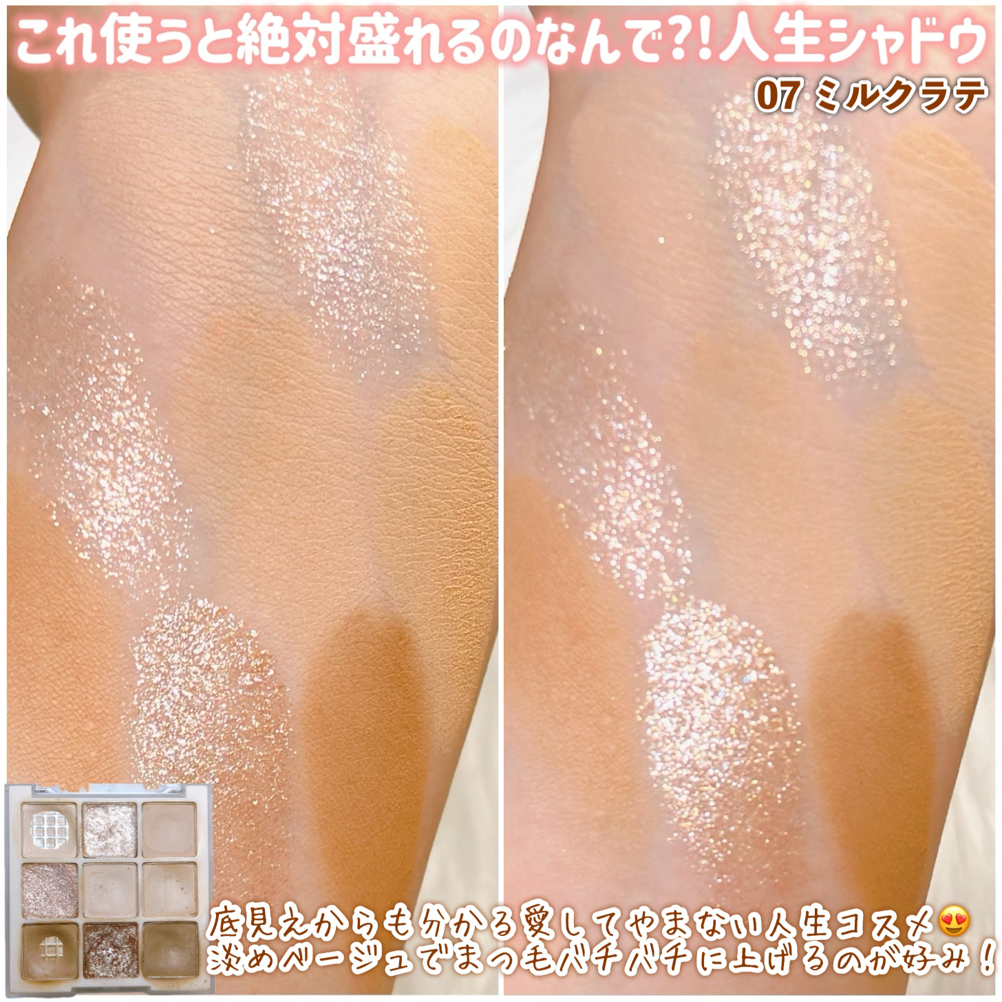 マットはかなりくすんだ色で、暗めのメイクに仕上がりがちに🤎 ツヤ感が大事だと言われるイエベ春でも、スモーキーメイク出来るんだ…!と思わせてくれたパレット。 愛して止まないミルクラテ、絶妙な柔らかベージュに透明感たっぷりのラメ✨️ 全色ラメ入りですが、真ん中2色のくすみと黄みが強く、どんよりした目元に…🥲 コーラルは大好きなんですが、このパレットは3滴白みを足したような色で、発色も弱くまぶたにも乗りづらく、かなり色白さんでないと使えない気がします…🥲 手持ちの中で1番黄み強いですが、1番完成度の高いです💕