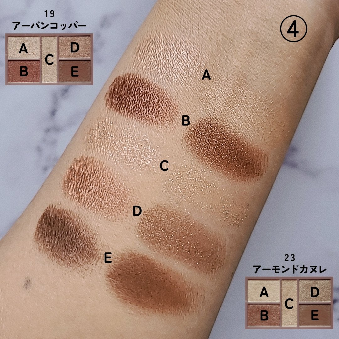 - 1枚のパレットで2つのスタイルが完成! 5色の欲ばりアイシャドウ♥ メインカラーを選んで2つのスタイルが楽しめる! A→B→D でスタイル1 A→C→D でスタイル2 繊細な粉質が、しっとりとまぶたに密着して色落ちを防ぎます。 透明感のあるキラうるトッピングジュエル(繊細ラメ)は、気分によってトッピング!
