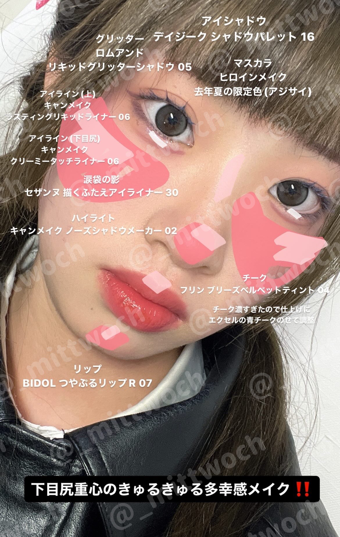 下地 キャンメイク/マーメイドスキンジェルUV C03 ノーズシャドウ/ハイライト キャンメイク/ノーズシャドウメーカー 02 チーク/アイシャドウ(涙袋だけ) セザンヌ/チークブラッシュ 03