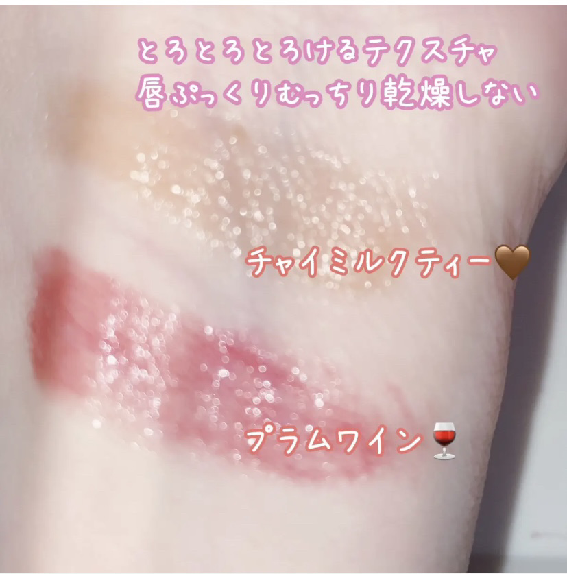 唇に塗った瞬間、体温でとろけて シロップのようなちゅるっとしたツヤ感がたまらなくかわいい🩷🩷 まるで蜂蜜のように唇の温度でとろ~りとろけて ほんのり透け感のあるむっちり、ちゅるんとしたかわいい唇に魅せてくれるよ💋 重みやベタベタ感が全くなく 薄い膜で唇を覆ってくれているようなむっちりとろとろ感がたまらん♡♡