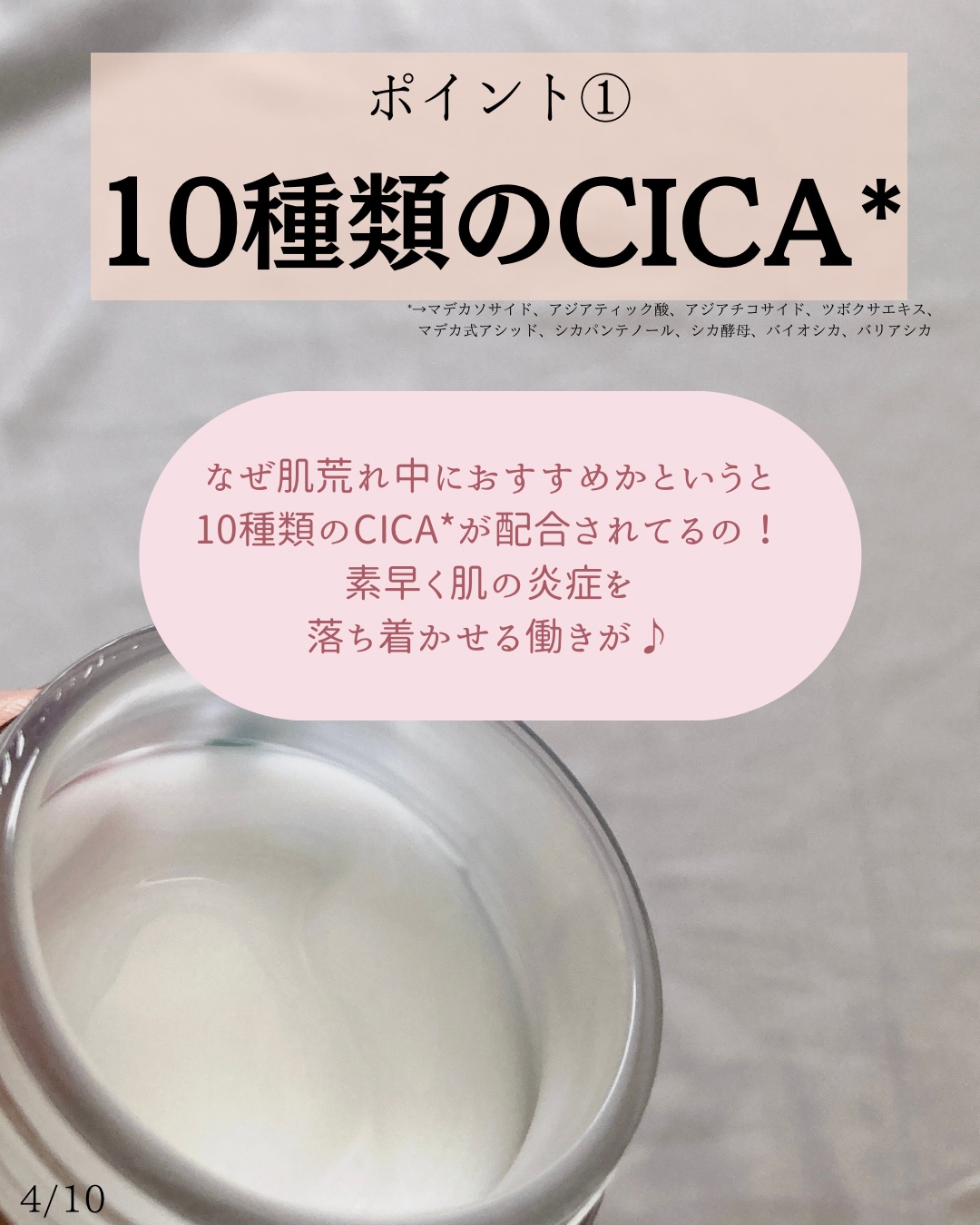 - <50ml> 水、グリセリン、BG、ジカプリリルエーテル、ナイアシンアミド、1、2-ヘキサンジオール、水添ポリデセン、ペンチレングリコール、炭酸ジカプリリル、ビニルジメチコン、カプリリルメチコン、(アクリル酸ヒドロキシエチル/アクリロイルジメチルタウリンNa)コポリマー、パンテノール、(アクリレーツ/アクリル酸アルキル(C10-30))クロスポリマー、ジメチコノール、ポリメチルシルセスキオキサン、トロメタミン、グリチルリチン酸2K、(アクリル酸グリセリル/アクリル酸)コポリマー、エチルヘキシルグリセリン、キサンタンガム、ツボクサ葉エキス、フルクトオリゴ糖、フィチン酸Na、アラントイン、乳酸桿菌発酵液、乳酸桿菌/ダイズ発酵エキス、レウコノストック/ダイコン根発酵液、酵母発酵エキス、トコフェロール、没食子酸エピガロカテキン、マデカッソシド、β-グルカン、ツボクサエキス、アシアチコシド、マデカシン酸、アシアチン酸 <ミニサイズ付きセット【数量限定】 (本体50ml+ミニ30ml)> 水、グリセリン、BG、ジカプリリルエーテル、ナイアシンアミド、1、2-ヘキサンジオール、水添ポリデセン、ペンチレングリコール、炭酸ジカプリリル、ビニルジメチコン、カプリリルメチコン、(アクリル酸ヒドロキシエチル/アクリロイルジメチルタウリンNa)コポリマー、パンテノール、(アクリレーツ/アクリル酸アルキル(C10-30))クロスポリマー、ジメチコノール、ポリメチルシルセスキオキサン、トロメタミン、グリチルリチン酸2K、(アクリル酸グリセリル/アクリル酸)コポリマー、エチルヘキシルグリセリン、キサンタンガム、ツボクサ葉エキス、フルクトオリゴ糖、フィチン酸Na、アラントイン、乳酸桿菌発酵液、乳酸桿菌/ダイズ発酵エキス、レウコノストック/ダイコン根発酵液、酵母発酵エキス、トコフェロール、没食子酸エピガロカテキン、マデカッソシド、β-グルカン、ツボクサエキス、アシアチコシド、マデカシン酸、アシアチン酸