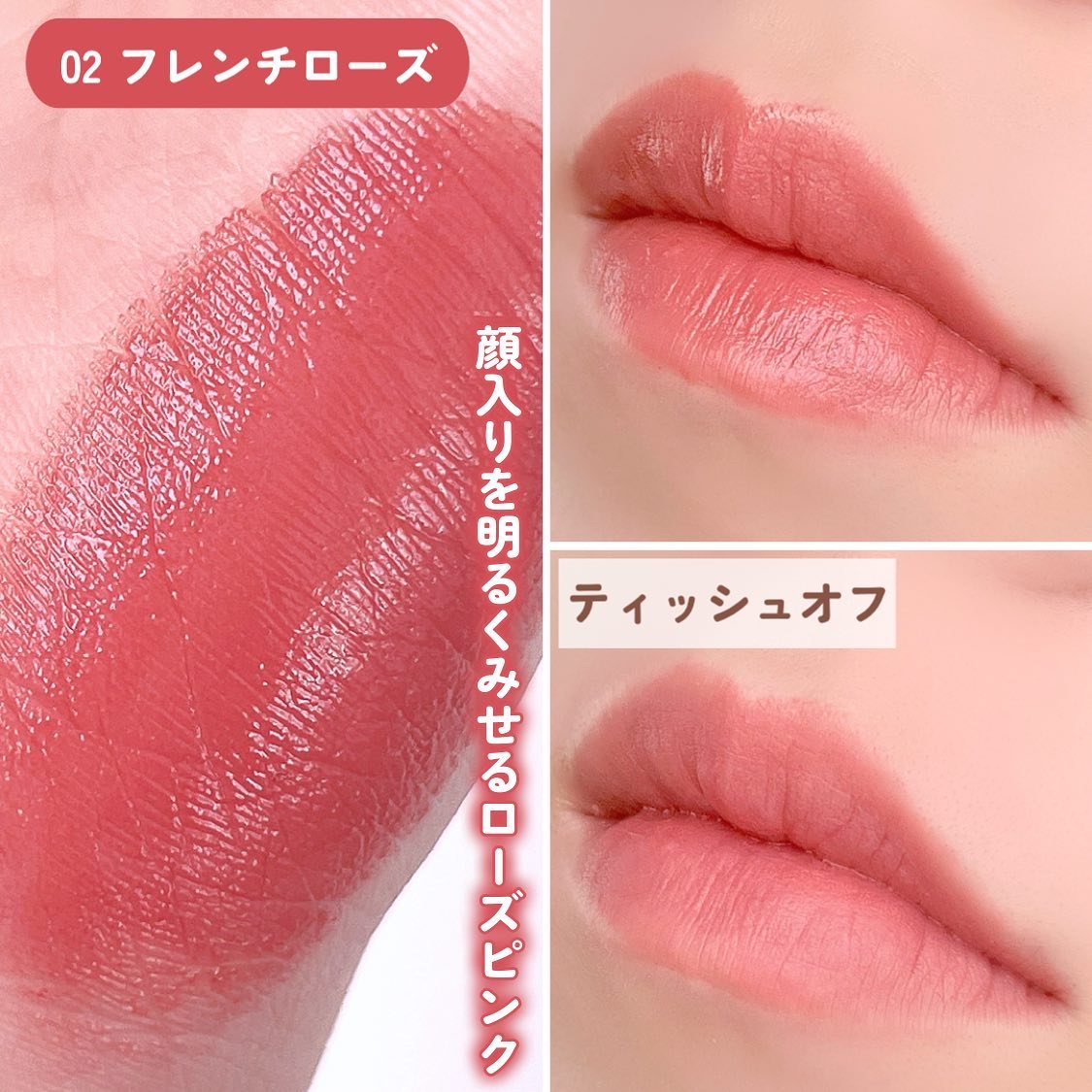 このリップは塗布後しばらくするとゲル層とシリコーン層の2層膜を形成!! ゲル層が唇にピタッと密着することで高いラスティング効果を実現し擦れに強く長時間色持ちをキープ!! そして塗布膜表面のシリコーン層が高い透明感と程よいツヤ感を演出してくれるんです😊 スルスルっと軽くなめらかな塗り心地で、唇にピタッと色が密着してくれている感じがすごいする✨ 1度塗りでも十分なくらい発色がとてもよく、ムラなく均一に綺麗に塗れるのがとても良き🙆♀️ 塗ってから60秒何もせずに待つと色持ちがUP!! 軽くティッシュオフしても色味が全然落ちないのが感動😭ツヤ感は落ちてしまうけど… 5種のオーガニック植物抽出成分を配合したり、アルコール等を使用してないので唇にも優しいので唇が荒れやすい方にもオススメです☺️