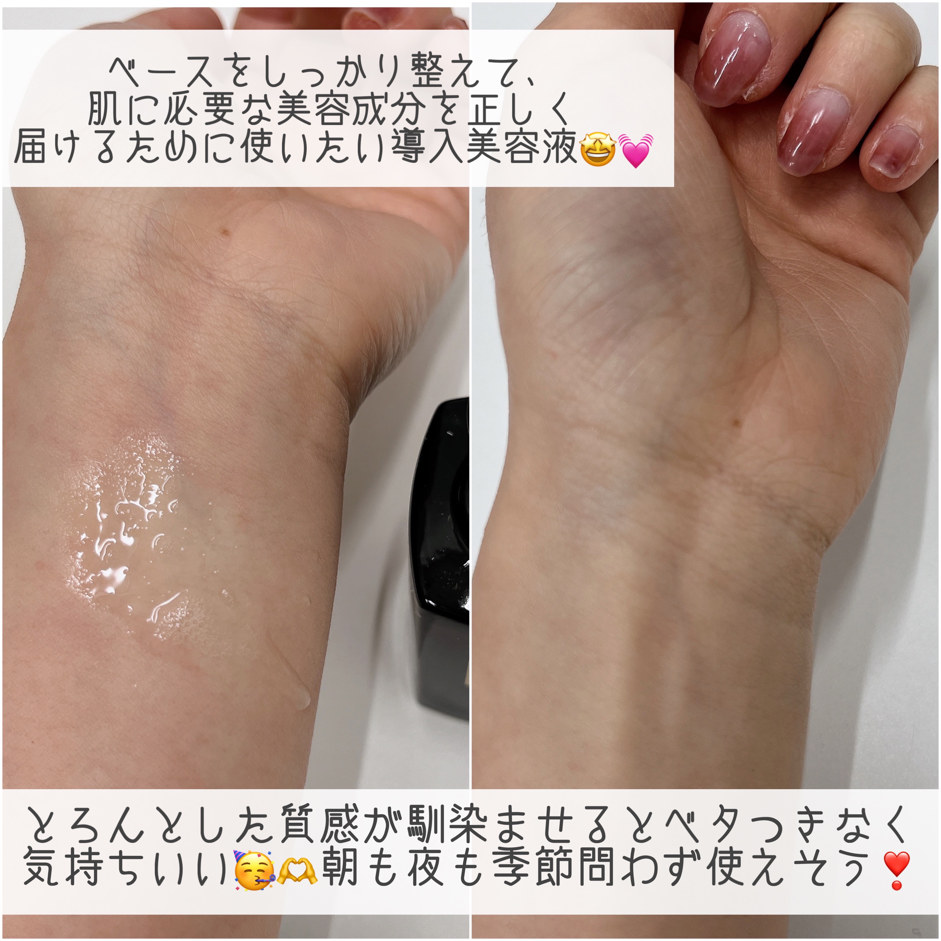 | 出した時はとろっとするのに 肌にのせると ぱしゃっとはじけるように すごくみずみずしく感じるの😇 | 詳細を見る | ||