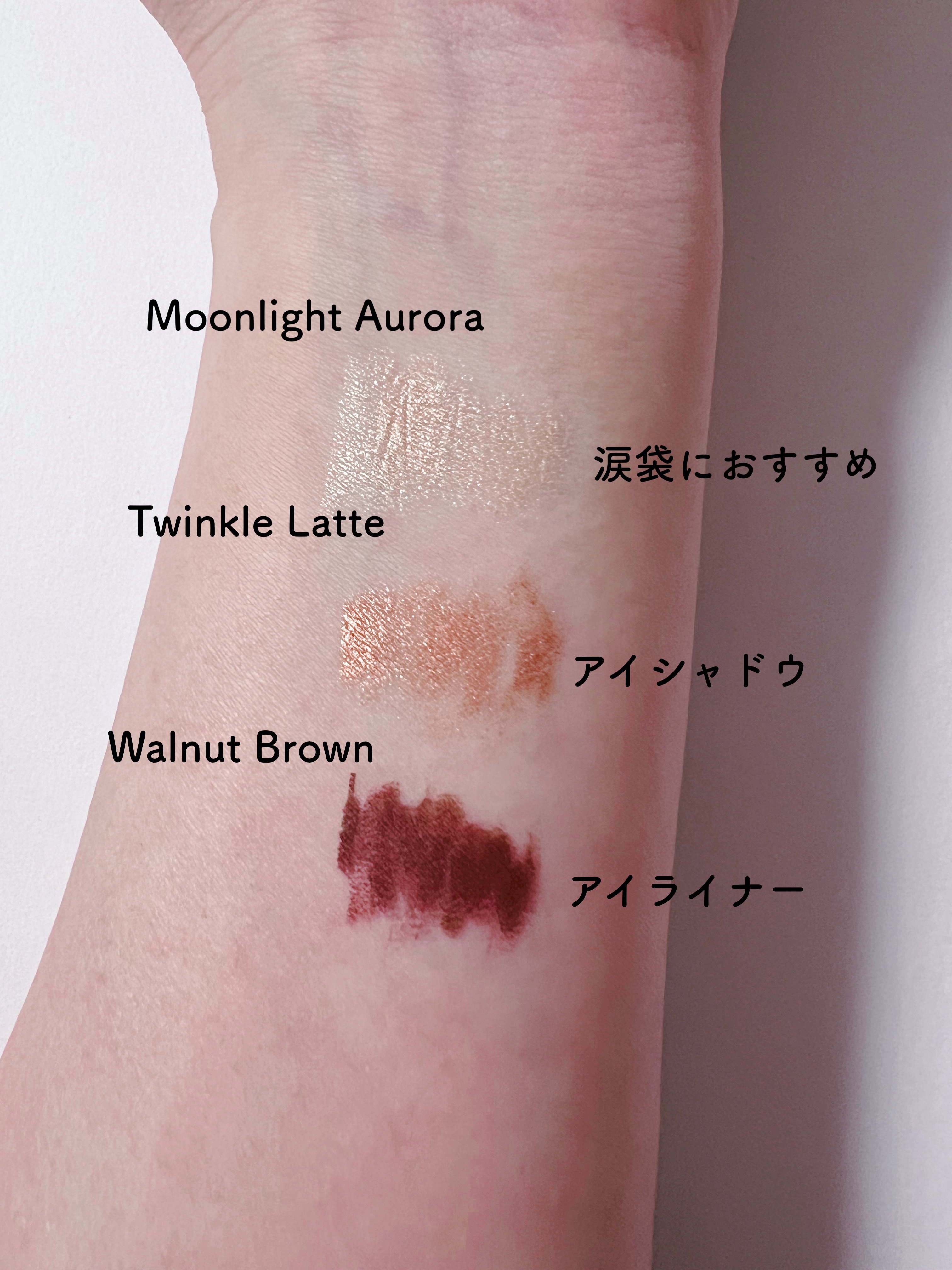 落ちにくく、滲みにくいです✏️密着も良く、するする描きやすかったです💗 ミルクブラウンは陰影にも⭕️ムーンライトオーロラ、スターライト綿菓子は涙袋にも可愛いです🥰 気になる方は是非チェックしてみてね🐰