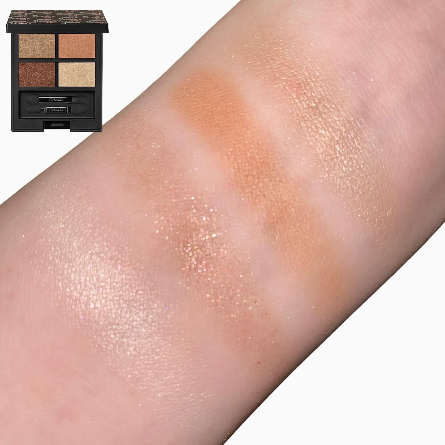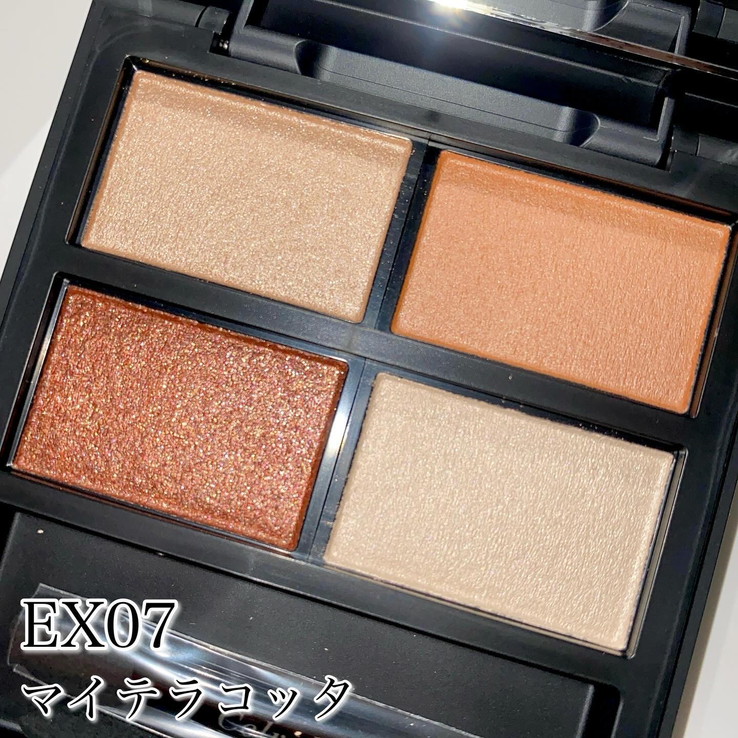 制作秘話も色々聞いてきました。 Vatic Eye Palette #ヴァティックアイパレット EX14 Front Row 🍹 お馴染みくすみテラコッタに眩いゴールドパールと、渋い赤茶の陰影が効いたスパイシーなパレットです。 ギラギラシャイニーなこの感じ、エレガントというよりむしろハードでカッコいい。中西さん曰く「カジュアルな服にあえて目もとは煌びやかなのが新しいなと思って」 自然な血色とかすかな陰影が出ます。「チーク塗ってます」感なく立体感を引き立てる、まさにステルスチーク的な存在。