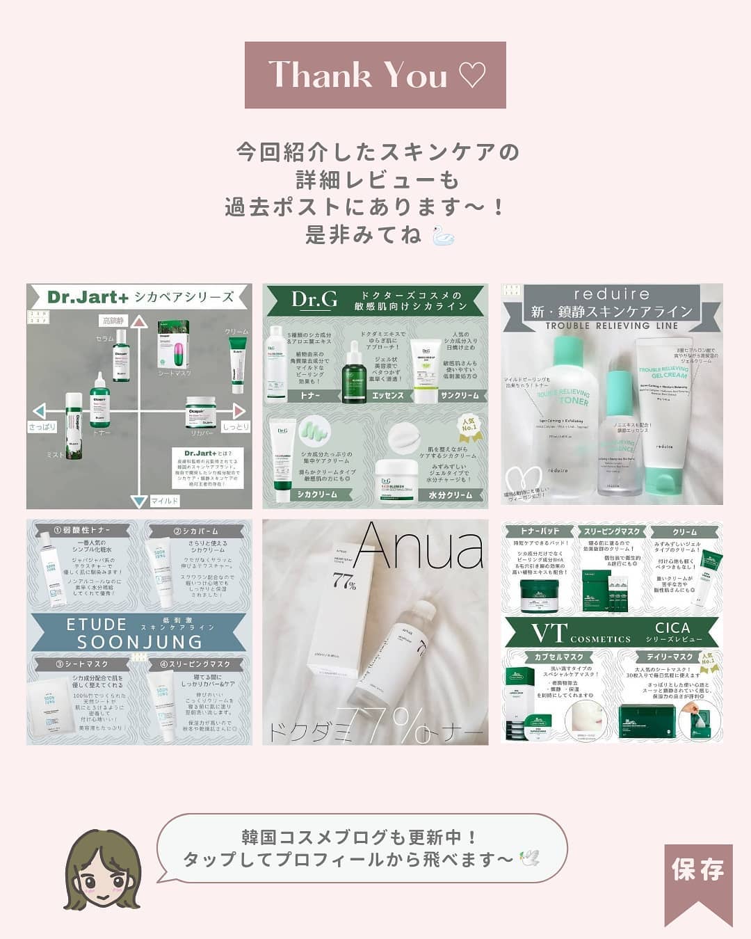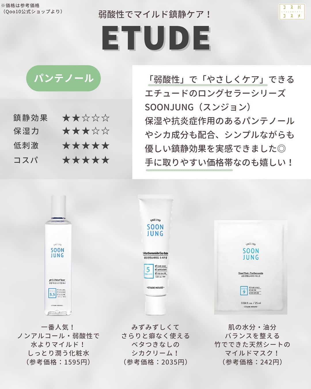 ドクタージャルト 皮膚科医監修の、開発されている ドクターズスキンケアブランドで 他の韓国スキンケアと比べると少〜しお高めですが 濃厚で高い鎮静効果が期待できます◎ 高保湿・低刺激なのも魅力! VTcosmetics 独自開発されたシカ成分「シカリオ」が 鎮静と肌バリア強化をサポート! マスクパックやトナーパッドなど アイテム数が豊富で選ぶのも楽しい! エチュード SOONJUNG(スンジョン) 保湿や抗炎症作用のあるパンテノールやシカ成分も配合 シンプルながらも優しい鎮静効果を実感できました◎ 手に取りやすい価格帯なのも嬉しい!