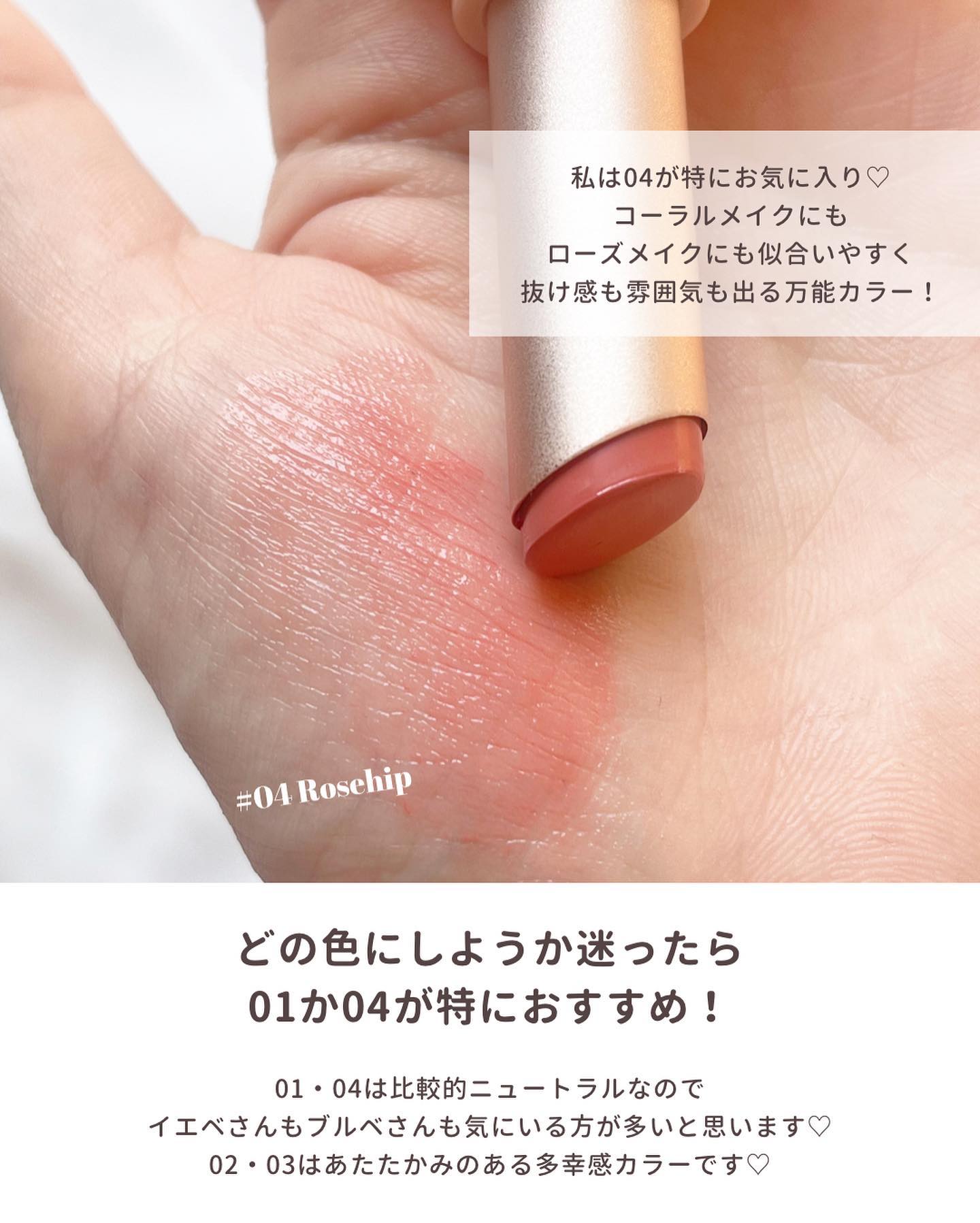 ツヤ2色とマット7色の構成になっていて、 リップはもちろん、チークとしても使える❣️ 03はブルベが使いやすいストロベリーカラー多め🍓 一番おすすめしたいのはマットとツヤの組み合わせ❣️ 淡めのカラーを全体にのせてから 内側に濃い色+ツヤを足すことで 可愛いグラデリップが簡単にできるよ💗