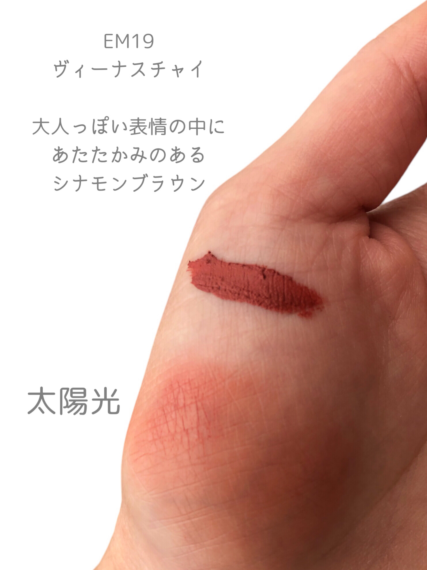 - <EM-J01 ピンクミスト> ジメチコン、ジメチコンクロスポリマー、トリベヘニン、リンゴ酸ジイソステアリル、(ビニルジメチコン/メチコンシルセスキオキサン)クロスポリマー、酸化チタン、セチルPEG/PPG-10/1ジメチコン、イソステアリン酸ソルビタン、(VP/ヘキサデセン)コポリマー、トリイソステアリン酸ポリグリセリル-2、ジイソステアリン酸ポリグリセリル-2、赤230(1)、赤202、黄4、香料、デヒドロ酢酸、酸化鉄 <EM-J02 ベルベットムード > ジメチコン、ジメチコンクロスポリマー、トリベヘニン、リンゴ酸ジイソステアリル、酸化チタン、(ビニルジメチコン/メチコンシルセスキオキサン)クロスポリマー、セチルPEG/PPG-10/1ジメチコン、イソステアリン酸ソルビタン、(VP/ヘキサデセン)コポリマー、トリイソステアリン酸ポリグリセリル-2、酸化鉄、赤202、ジイソステアリン酸ポリグリセリル-2香料、ジメチルシリル化シリカ、デヒドロ酢酸、黄4、黄5 <EM01 ポップスターブリック> ジメチコン、ジメチコンクロスポリマー、トリベヘニン、トリイソステアリン酸ポリグリセリル-2、酸化鉄、(ビニルジメチコン/メチコンシルセスキオキサン)クロスポリマー、セチルPEG/PPG-10/1ジメチコン、イソステアリン酸ソルビタン、(VP/ヘキサデセン)コポリマー、黄5、リンゴ酸ジイソステアリル、赤202、ジイソステアリン酸ポリグリセリル-2、香料、デヒドロ酢酸、水添ロジン酸メチル <EM03 モデルテラコッタ> ジメチコン、ジメチコンクロスポリマー、トリイソステアリン酸ポリグリセリル-2、トリベヘニン、黄4、酸化鉄、(ビニルジメチコン/メチコンシルセスキオキサン)クロスポリマー、セチルジメチコンコポリオール、イソステアリン酸ソルビタン、(VP/ヘキサデセン)コポリマー、リンゴ酸ジイソステアリル、香料、デヒドロ酢酸、水添ロジン酸メチル <EM05 美人シナモン> ジメチコン、ジメチコンクロスポリマー、トリベヘニン、リンゴ酸ジイソステアリル、酸化チタン、酸化鉄、トリイソステアリン酸ポリグリセリル-2、(ビニルジメチコン/メチコンシルセスキオキサン)クロスポリマー、セチルジメチコンコポリオール、イソステアリン酸ソルビタン、(VP/ヘキサデセン)コポリマー、香料、赤202、ジイソステアリン酸ポリグリセリル-2、デヒドロ酢酸、水添ロジン酸メチル <EM07 ファッショニスタココア> ジメチコン、ジメチコンクロスポリマー、トリイソステアリン酸ポリグリセリル-2、トリベヘニン、赤227、(ビニルジメチコン/メチコンシルセスキオキサン)クロスポリマー、酸化鉄、セチルジメチコンコポリオール、イソステアリン酸ソルビタン、(VP/ヘキサデセン)コポリマー、黄5、リンゴ酸ジイソステアリル、香料、デヒドロ酢酸、水添ロジン酸メチル <EM08 インフルエンサーモカ> ジメチコン、ジメチコンクロスポリマー、トリベヘニン、トリイソステアリン酸ポリグリセリル-2、(ビニルジメチコン/メチコンシルセスキオキサン)クロスポリマー、リンゴ酸ジイソステアリル、酸化鉄、酸化チタン、セチルジメチコンコポリオール、イソステアリン酸ソルビタン、(VP/ヘキサデセン)コポリマー、黄5、赤202、ジイソステアリン酸ポリグリセリル-2、香料、デヒドロ酢酸、水添ロジン酸メチル <EM09 セレブブラウン> ジメチコン、ジメチコンクロスポリマー、トリベヘニン、リンゴ酸ジイソステアリル、酸化鉄、酸化チタン、トリイソステアリン酸ポリグリセリル-2、(ビニルジメチコン/メチコンシルセスキオキサン)クロスポリマー、セチルジメチコンコポリオール、イソステアリン酸ソルビタン、(VP/ヘキサデセン)コポリマー、香料、赤202、ジイソステアリン酸ポリグリセリル-2、デヒドロ酢酸、水添ロジン酸メチル <EM10 クイーンローズティー> ジメチコン、ジメチコンクロスポリマー、トリベヘニン、トリイソステアリン酸ポリグリセリル-2、(ビニルジメチコン/メチコンシルセスキオキサン)クロスポリマー、リンゴ酸ジイソステアリル、酸化チタン、酸化鉄、セチルジメチコンコポリオール、イソステアリン酸ソルビタン、(VP/ヘキサデセン)コポリマー、赤227、香料、デヒドロ酢酸、水添ロジン酸メチル <EM11 アーティストモーヴ> ジメチコン、ジメチコンクロスポリマー、トリベヘニン、リンゴ酸ジイソステアリル、(ビニルジメチコン/メチコンシルセスキオキサン)クロスポリマー、酸化チタン、トリイソステアリン酸ポリグリセリル-2、酸化鉄、セチルジメチコンコポリオール、イソステアリン酸ソルビタン、(VP/ヘキサデセン)コポリマー、黄5、赤202、ジイソステアリン酸ポリグリセリル-2、香料、デヒドロ酢酸、水添ロジン酸メチル <EM12 高嶺の花コーラル> ジメチコン、ジメチコンクロスポリマー、トリベヘニン、リンゴ酸ジイソステアリル、酸化チタン、(ビニルジメチコン/メチコンシルセスキオキサン)クロスポリマー、トリイソステアリン酸ポリグリセリル-2、セチルジメチコンコポリオール、イソステアリン酸ソルビタン、(VP/ヘキサデセン)コポリマー、黄4