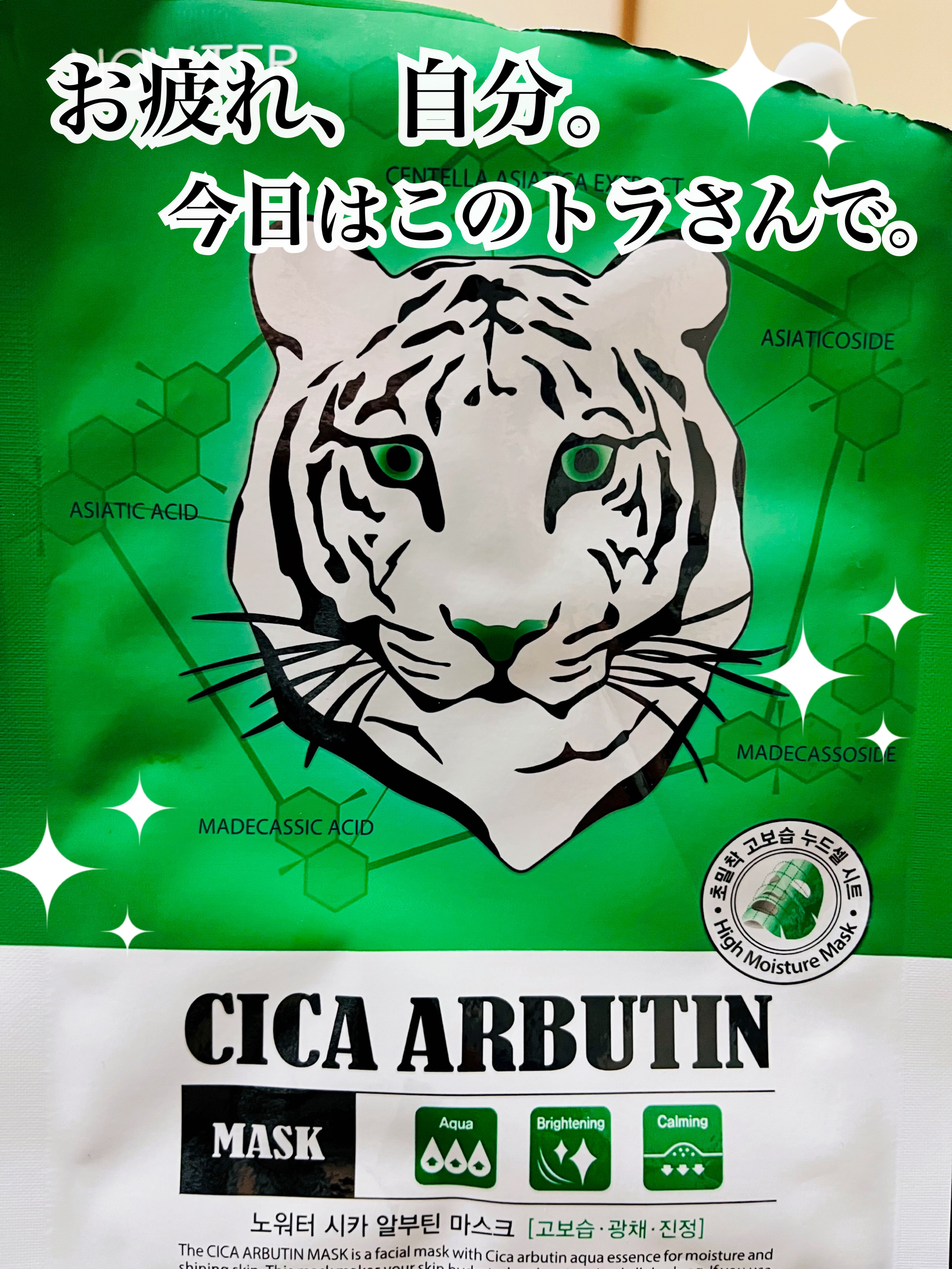 ノーウォーターの名前の通り精製水が入ってなくて、こだわりの成分がたっぷり配合されてるんだそう☝️ 薄いシートなのに液がひたっひたで、10分以上付けていても全く乾かない!!!! しかも袋の中にはまだたっぷりエキスが💧 ビタタイガーマスク ビタミン&青みかんエキス*1でクリア*2な肌へ導いてくれるんだそう🍊 ティーツリーオイルマスク ティーツリー由来成分*3配合。肌のうるおいバランスを整えてくれるんだそう🌿 シカアルブチンマスク 5つのツボクサ由来成分*4が肌を素早く整えてくれるんだそう! ちなみに私…ビタとシカは、常にストックしてるほどの愛用者です♥ 今回ティーツリーは初めて使ったんやけど、近々ストックの仲間入りしそうです✨