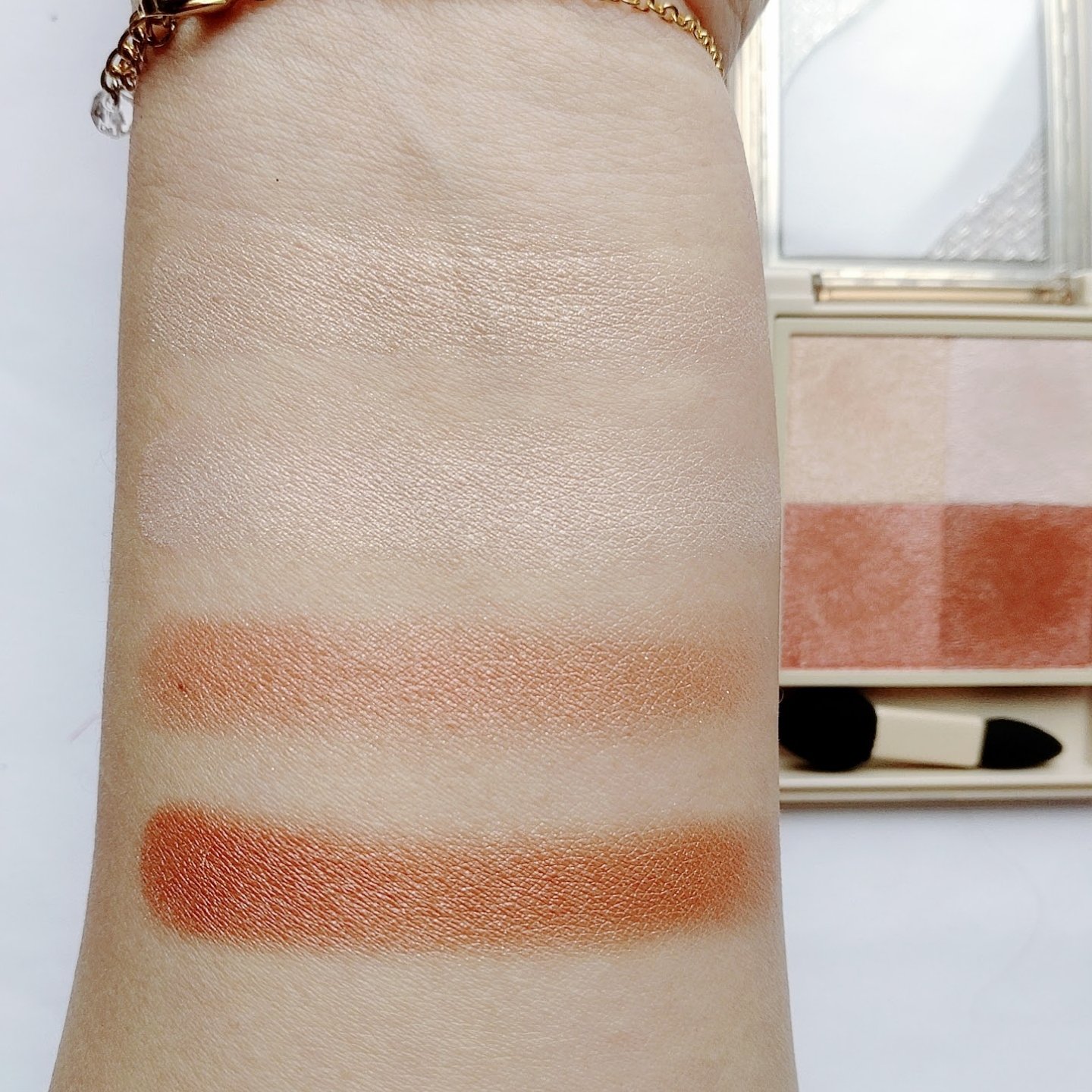プチプラのクオリティじゃないっ!! 発売前からチェックしていたけれど、ここまで可愛いとは…😆 絶妙カラーで目もとのくすみを飛ばして*明るい印象に🩷 横割りグラデーションでメイクし、立体感をより出したかったので最後に1番左のカラーを上まぶたの真ん中と涙袋にのせています🙆 肌馴染みも良くて粉飛びも感じにくかったです💕 ブラウンの方も店頭に出てたら買おうかな💓