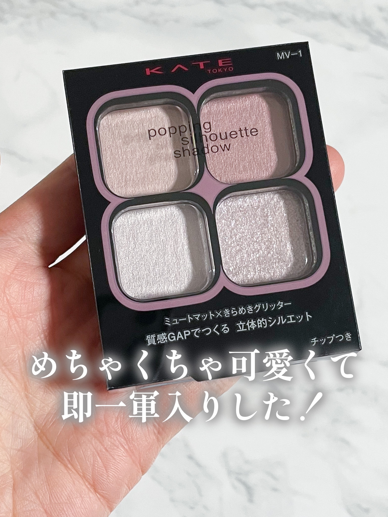 ミュートマット×クリアグリッター 2つの質感を使うことでクリっと丸く立体感のある目元に。 今までのクールなKATEのイメージを覆す丸くてかわいいパケのアイシャドウ💕 ラメを使うと立体感が出てくれて透明感のある丸い目にしてくれるように感じます