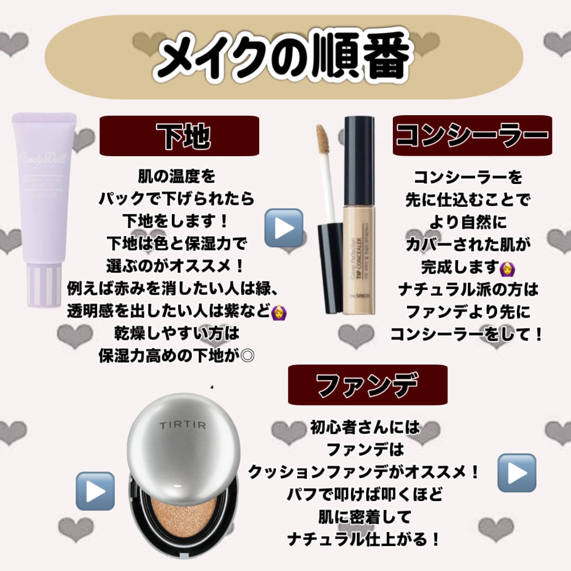 メイク上手になりたいからめっちゃ参考になる!! クッションファンデって若いけどした方が良いかなぁーー? ティルティルいろんな色あるから悩む😕 パックとかも朝できるようにしてみるねーー!