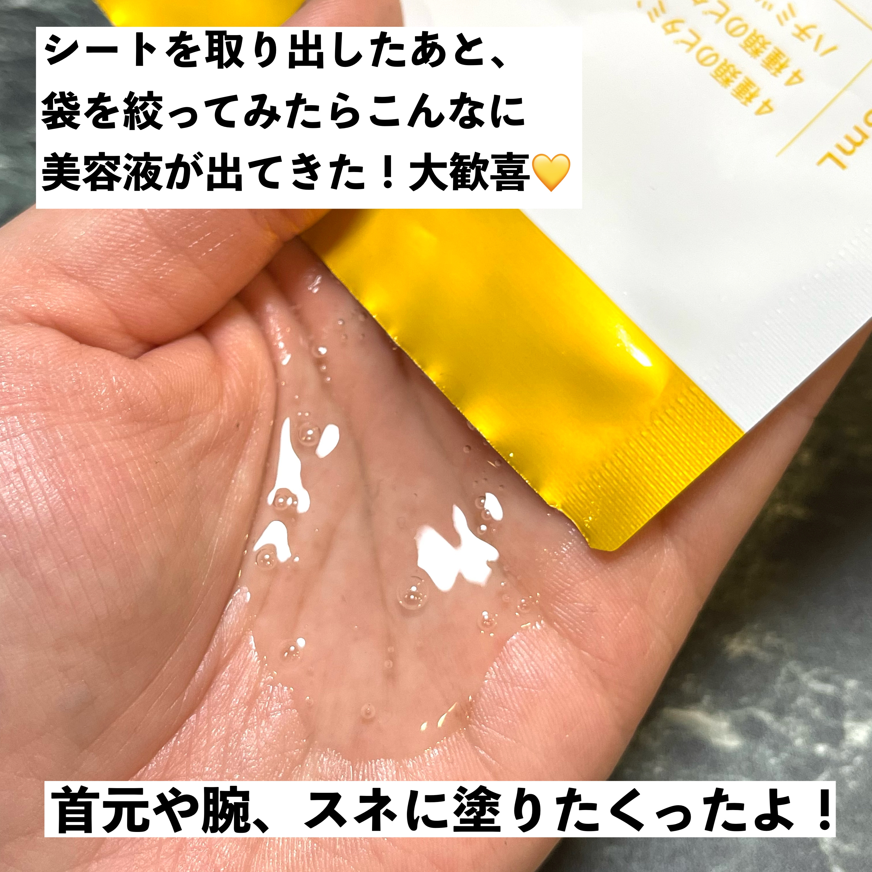密着力もよく美容液もヒタヒタに含まれていて好きです😍 シートも柔らかく肌に良さげです👍 特にお肌が乾燥を感じてるときは15分間の使用が良いみたいです❣️ 薬局などで手軽に購入出来るのでまた購入したいマスクです😆‼️