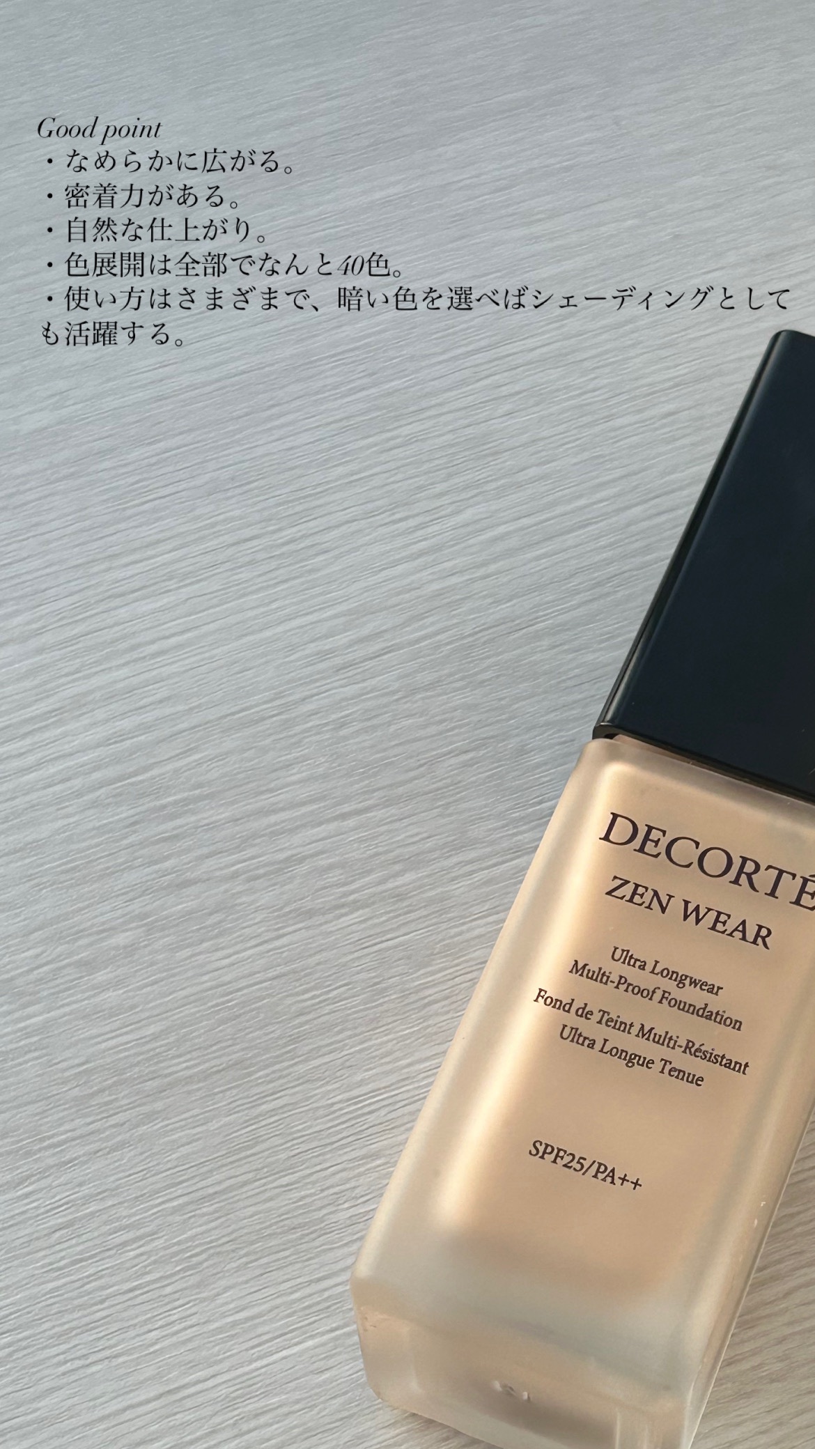 カラーバリエーションが豊富で、自分の好みに合わせて選択することができます。 塗ったときから肌がパッと明るくなり、薄い膜のような感じで厚塗り感がなく、でも崩れにくいです。 私はすぐには気づかなかったのですがグリーンフローラルムスキーの香りとなっておりました。