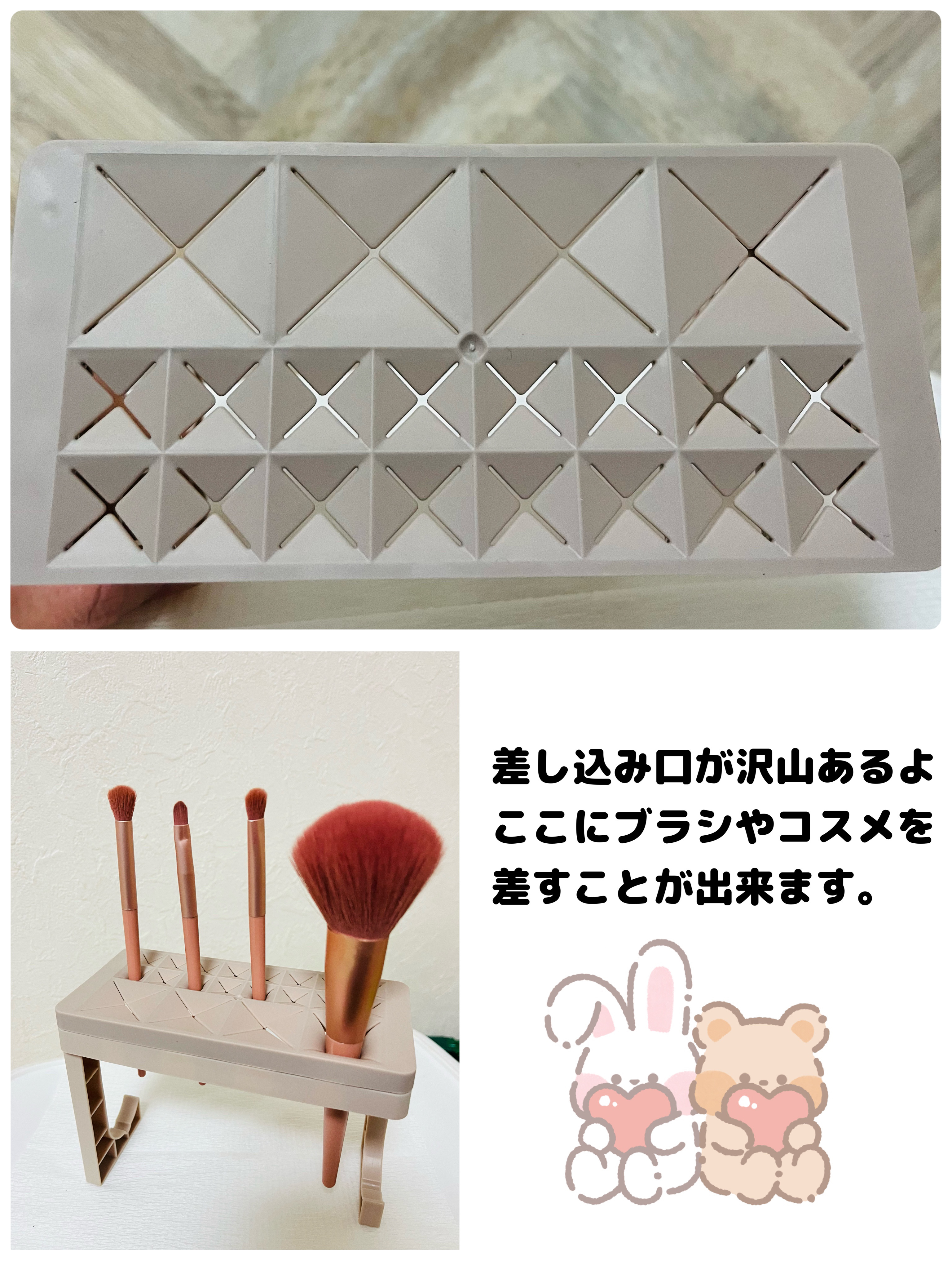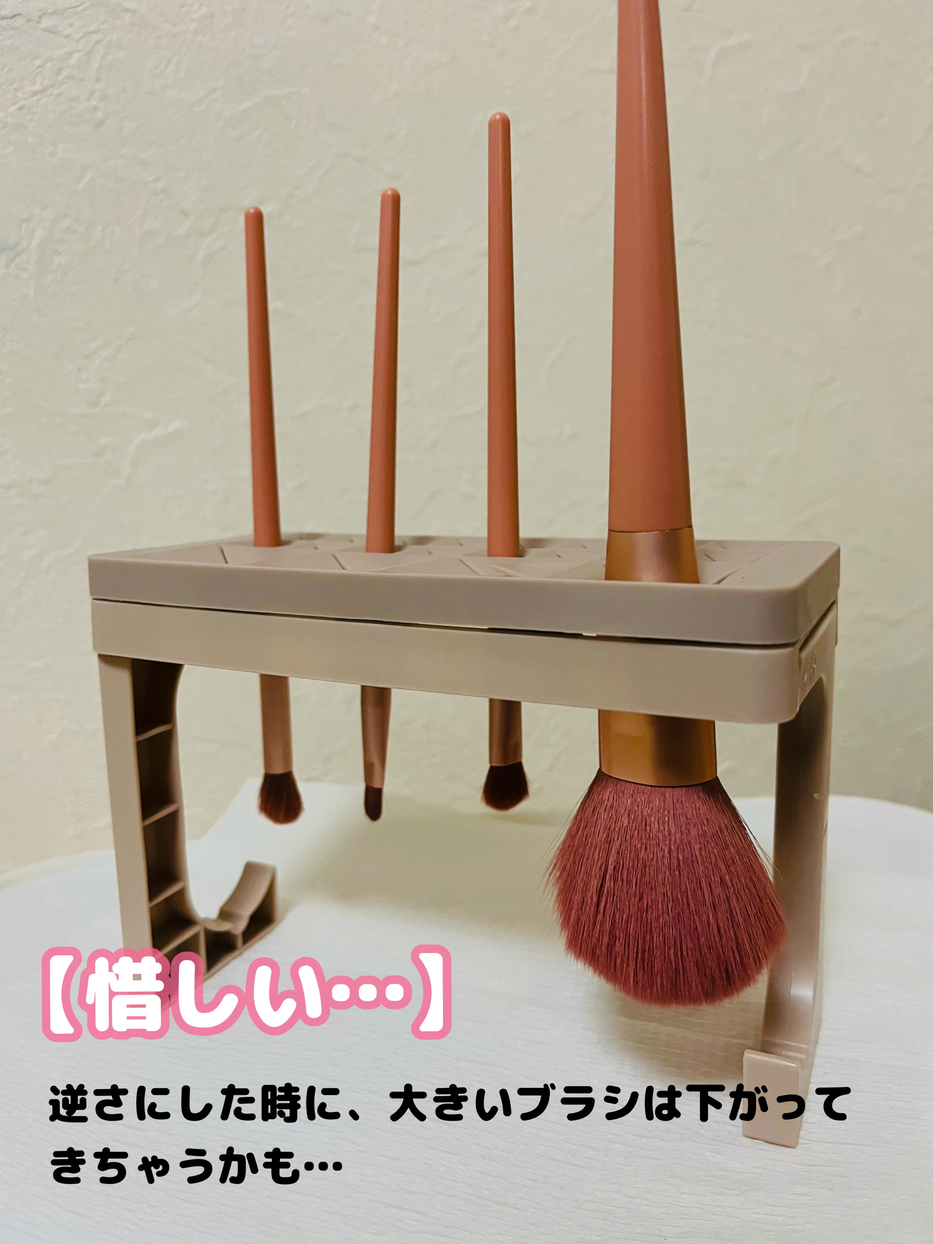太いブラシ4本、細いブラシ16本を1度に挿せる シリコーン質感なので濡れたブラシをそのまま 挿してもふやけたり質感が変化したりしない 互違いのフックで傾けた時などに落ちにくい 逆さにした干す・乾燥させる事も出来る シリコーン質感 よく使うブラシはそのまま立てかけて洗う時に 纏めて持って行けるので便利 ずっと探したり諦めたりしてやっと見つけた商品 差し込む時もスムーズなのでお勧め