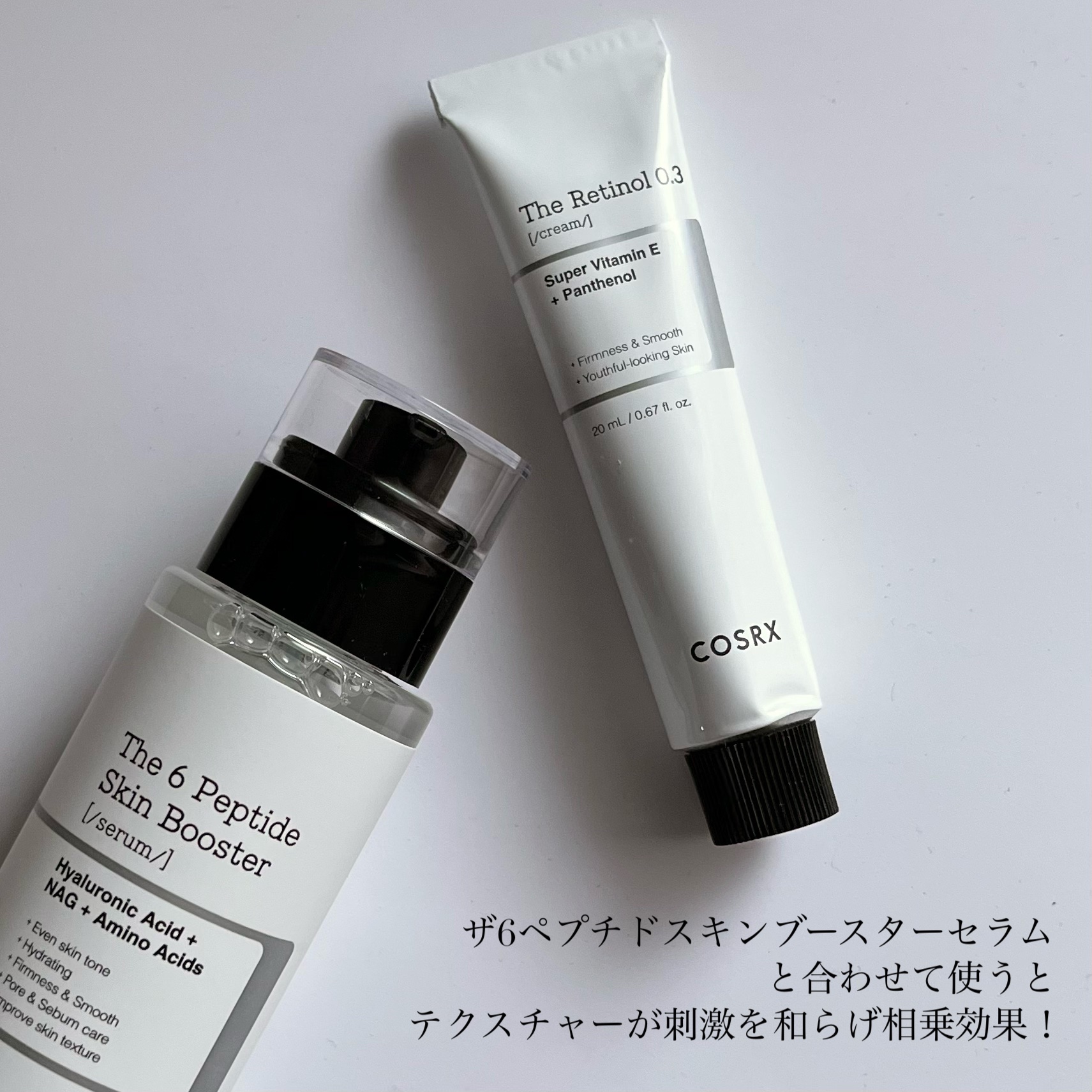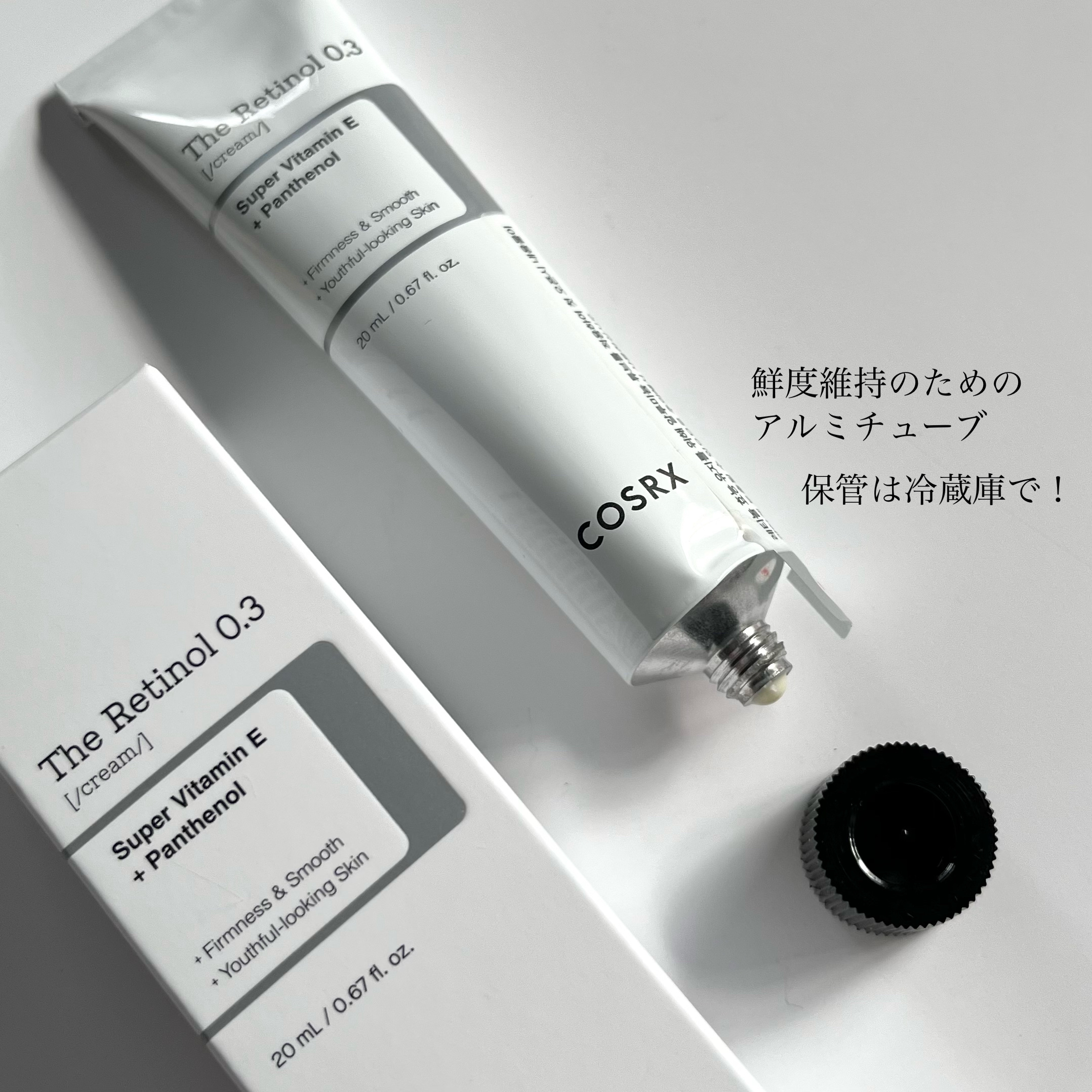 ■COSRXRXザ・レチノール0.3クリーム夜に高濃度ビタミンC美容液を使う日々に一区切りついたので夜レチ再開!冷蔵庫保管のスキンケアを片したいので再開早々に高濃度を投入する暴挙に出ました。以前LIPSで当選した0.1%クリームが良かったので...