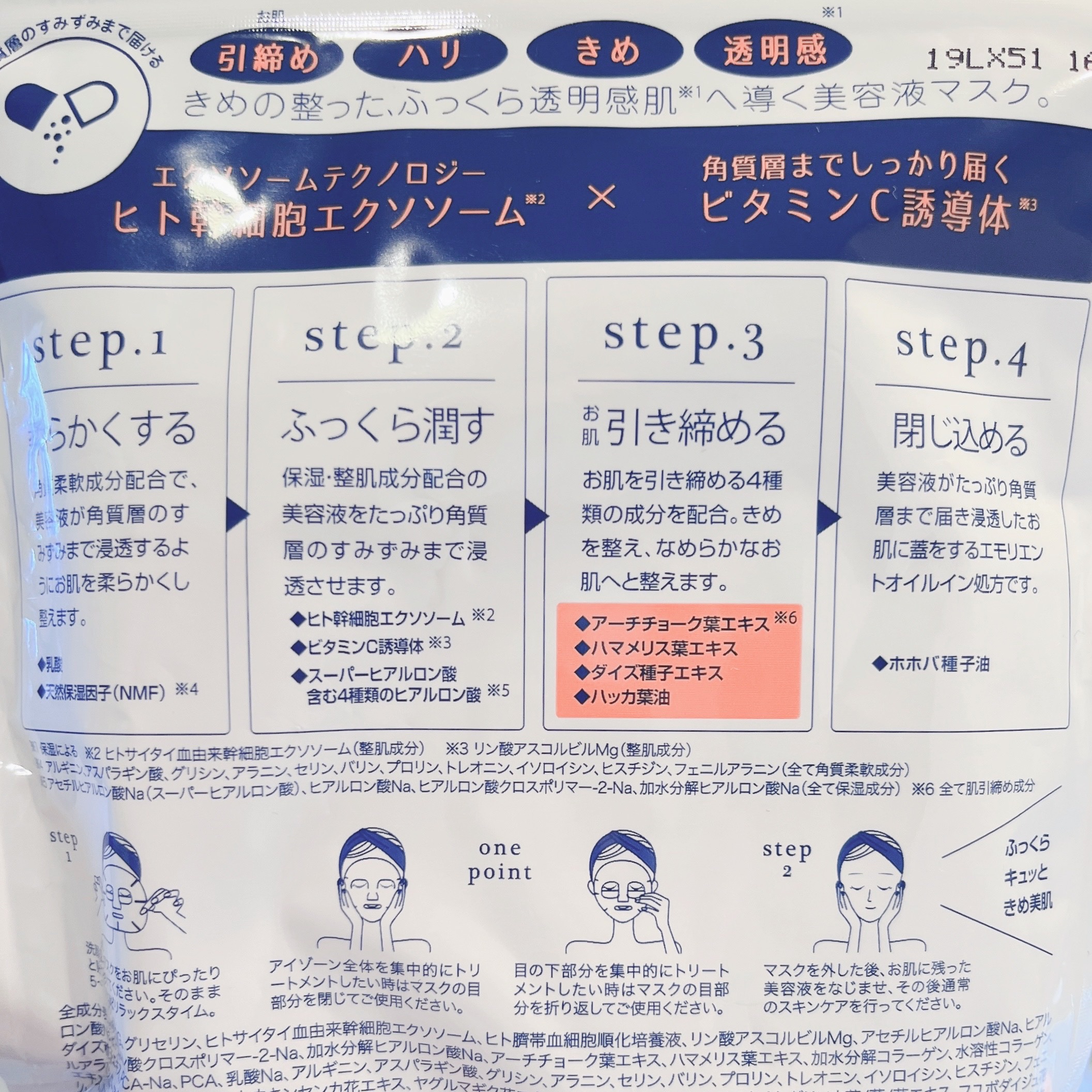 - ヒト幹細胞エクソソーム*1のシートマスク。ビタミンC誘導体*2も配合し、乾燥による毛穴ケアにおすすめです。天然コットンに液量がたっぷり浸透した贅沢シートマスクです。 *1ヒトサイタイ血由来幹細胞エクソソーム(整肌成分) *2整肌成分
