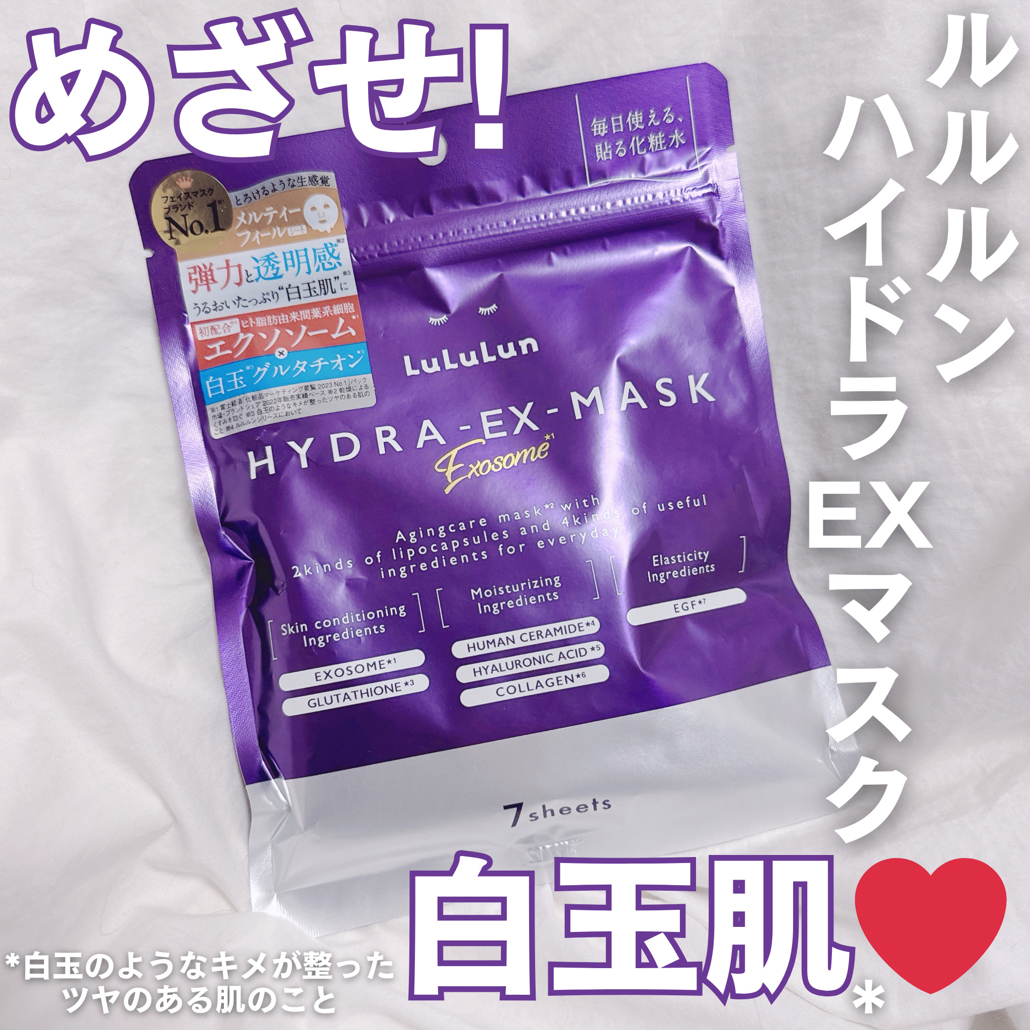 - ルルルンハイドラシリーズから新登場。うるおいにプラスするのは、「エクソソーム*1」。先端再生テクノロジーにインスパイアされた、デイリーエイジングケア※1マスクです。白玉※2グルタチオン*2をプラス配合し、弾力・透明感※3・つやめきのあるなめらかなお肌へ導きます。 (*1 整肌成分 ヒト脂肪由来間葉系細胞エクソソーム *2 整肌成分 グルタチオン、アルブチン、レシチン ※1 年齢に応じて肌へうるおいと弾力を与えるケアのこと ※2 白玉のようなキメが整ったツヤのある肌のこと ※3 うるおいを与えて、乾燥によるくすみを防ぐ)