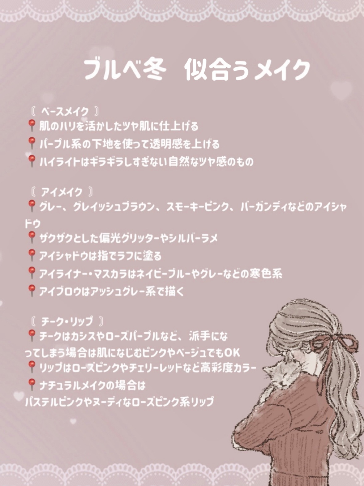 ベースメイクの順番はファンデーションの種類によっても違うのですが、 アイメイクはアイシャドウ→ビューラー→アイライン→マスカラという順番で行います。 アイメイクとのバランスを考えながら、どのリップを塗るかを決めます。 パウダーチークとクリームチークがありますが、クリームチークはムラになりやすいので初心者さんはパウダーがいいかも🙆♀️ ベースメイクの最後でもOKですが、全体のバランスを見ながら入れることでシェーディングが濃くなりすぎたりハイライトを付けすぎるなどの失敗が少なくなります。