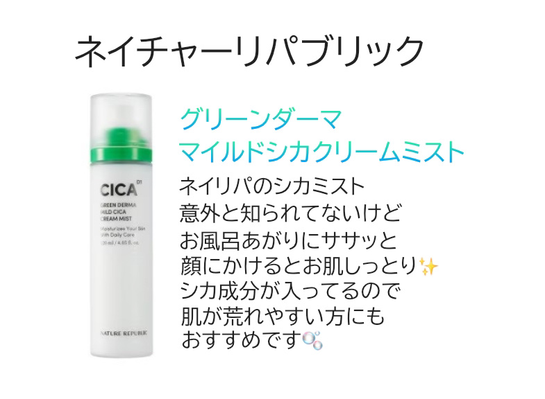 ここ最近ずーとお風呂あがり、メイク前に使っているスキンケア紹介しまぁす(⑉•ᴗ•⑉)ネイチャーリパブリックグリーンダーママイルドシカクリームミスト 125ml●センテラアジアティカ成分配合センテラアジアチカ成分が含まれて荒れた肌の健康を守り、...