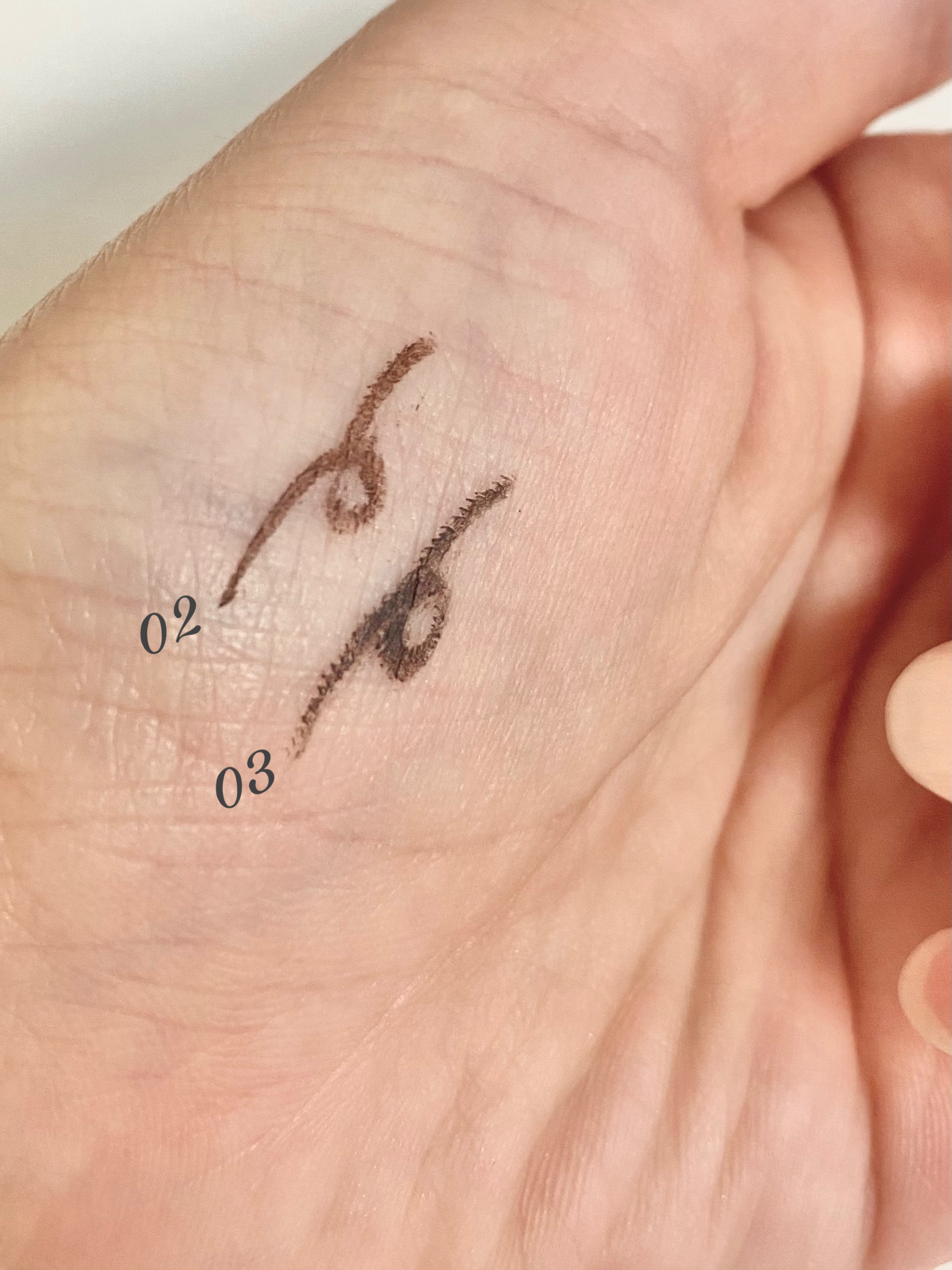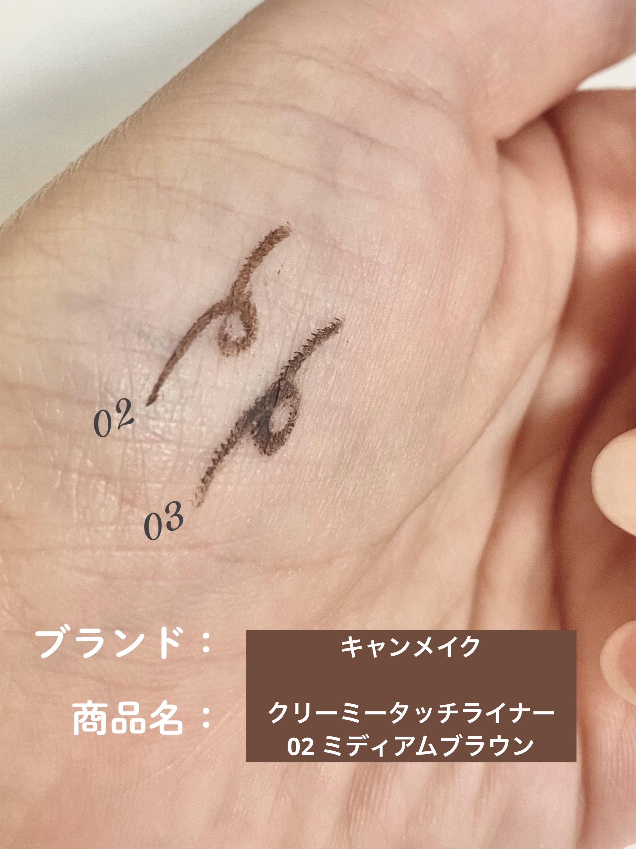 とにかくなめらかな描き心地が手放せなくなります。 発色も良く長時間色落ちしない。カラーが豊富でプチプラなので使い分けできる。 02ミディアムブラウンは濃いブラウンで垢抜けつつ目元もしっかり締まるオススメカラーです😊