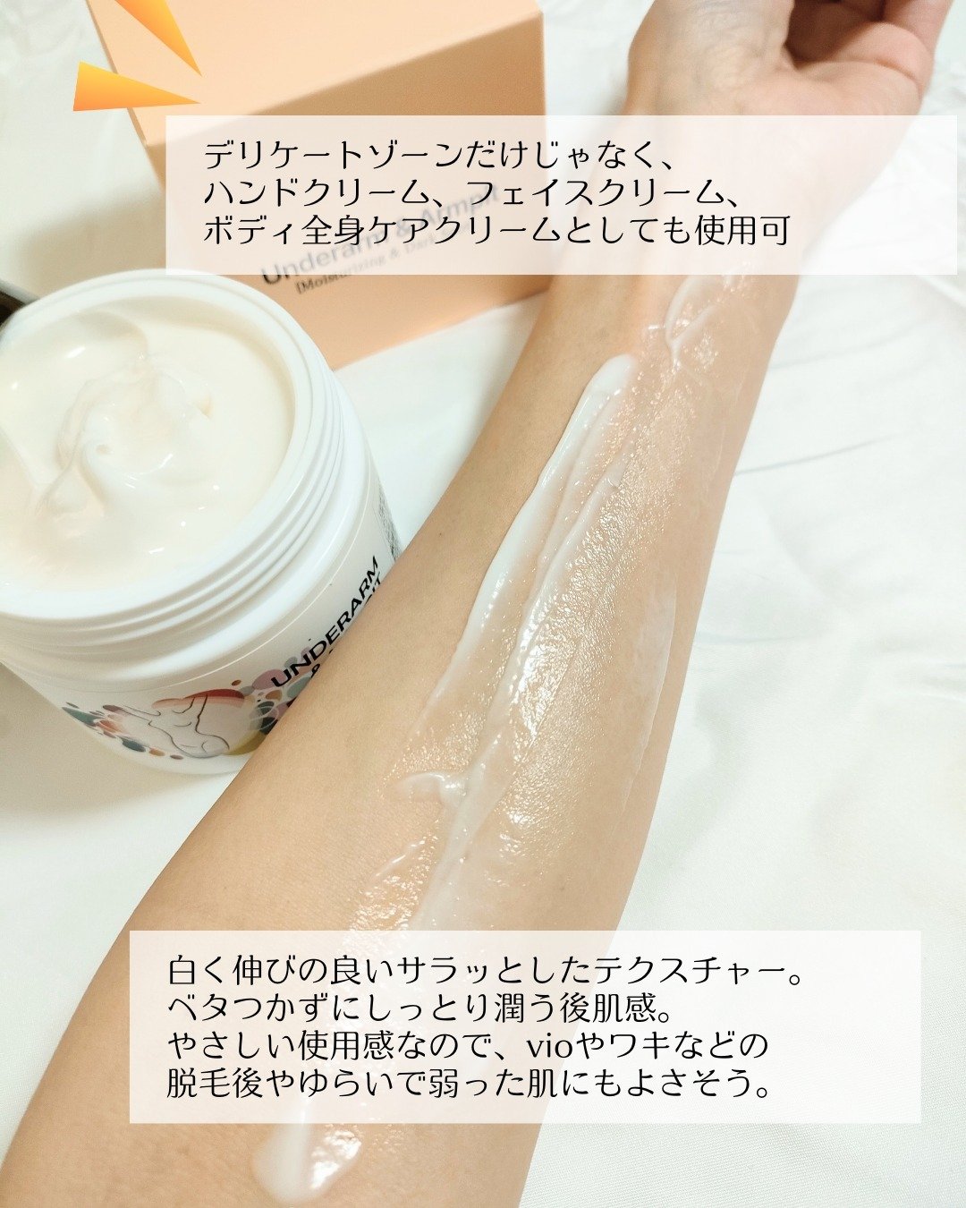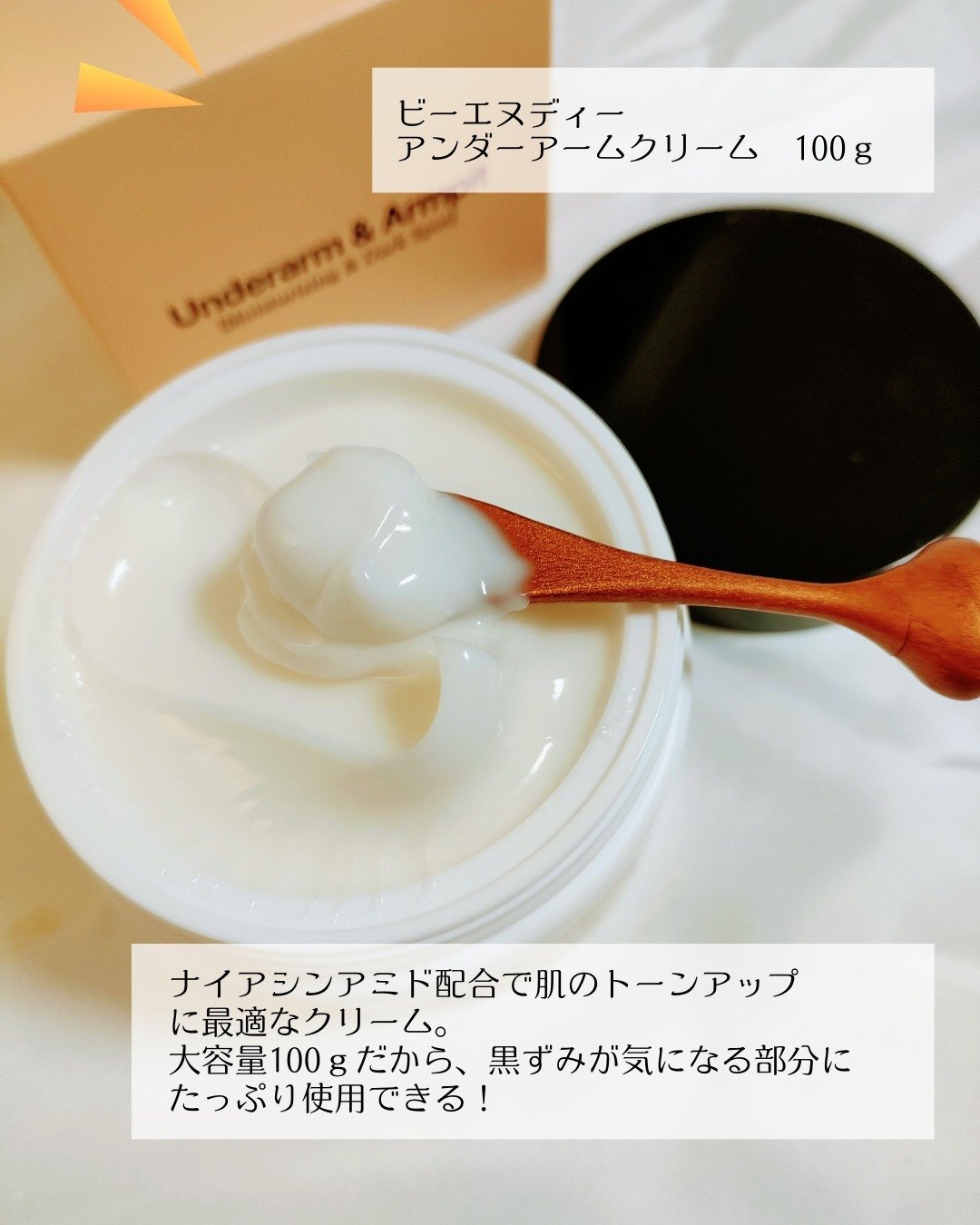 Q0010ボディケア部門で1位を獲得したこともある人気のボディクリーム♪ アンダーアームクリームは、韓国から生まれたボディ全身及びデリケートゾーン 黒ずみをトーンアップさせる黒ずみケアクリーム✨ ナイアシンアミドをたっぷり配合したクリームで顔以外の全身の黒ずみに使用可能〜🤍 大容量の100g入りだからたっぷり使ってもコスパも良くて大満足✨ しっとりーな保湿力も良き🤍